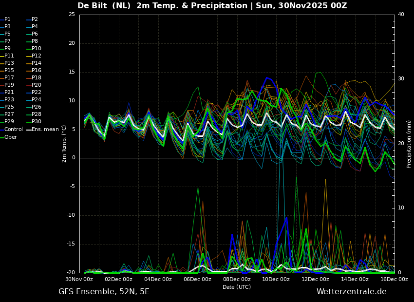 De maximum temperatuur is meeste van de tijd 7 a 8 graden en neerslag lijkt er (vrijwel) niet te gaan vallen.
