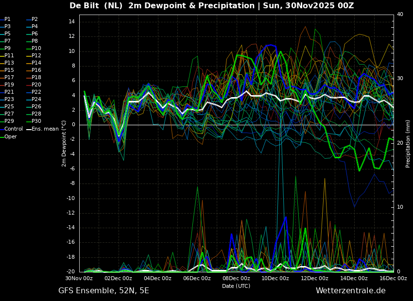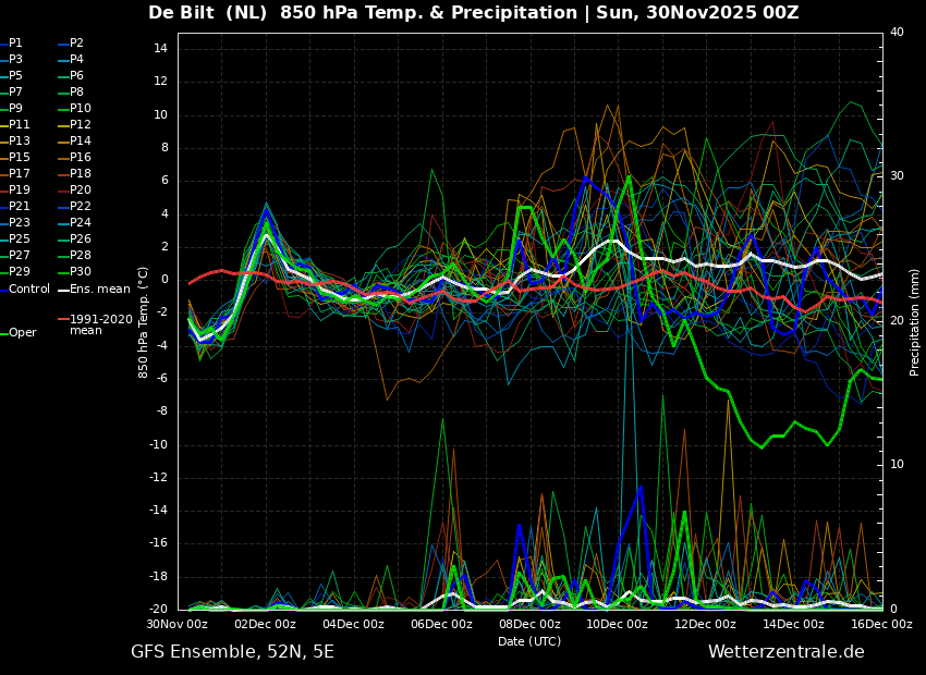 Waar deze in het T2m ensemble nog wat steun heeft, is de Oper in het T850 ensemble echt een enorme uitschieter.