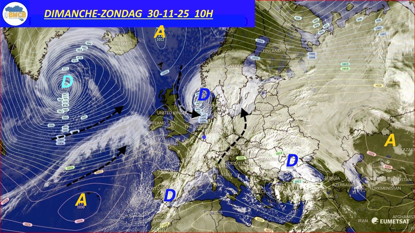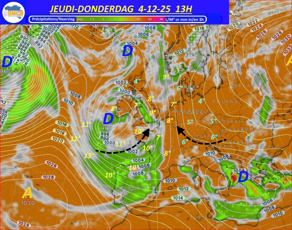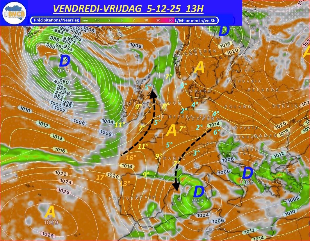 Halverwege de week worden nieuwe depressies boven de nabije oceaan verwacht. Eén daarvan, uitgediept tot 993 hPa, trekt donderdag van de Golf van Biskaje naar het westen van het Middellandse Zeegebied. Hierdoor komen onze regio’s vrijdag onder invloed van een rug van hoge druk van ongeveer 1018 hPa, uitgestrekt van Bretagne tot Nederland.