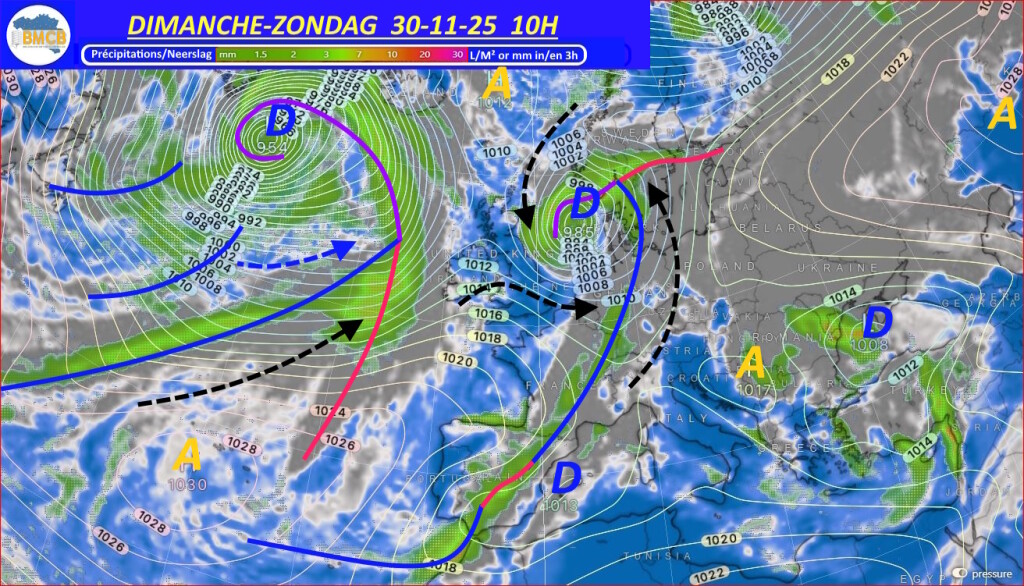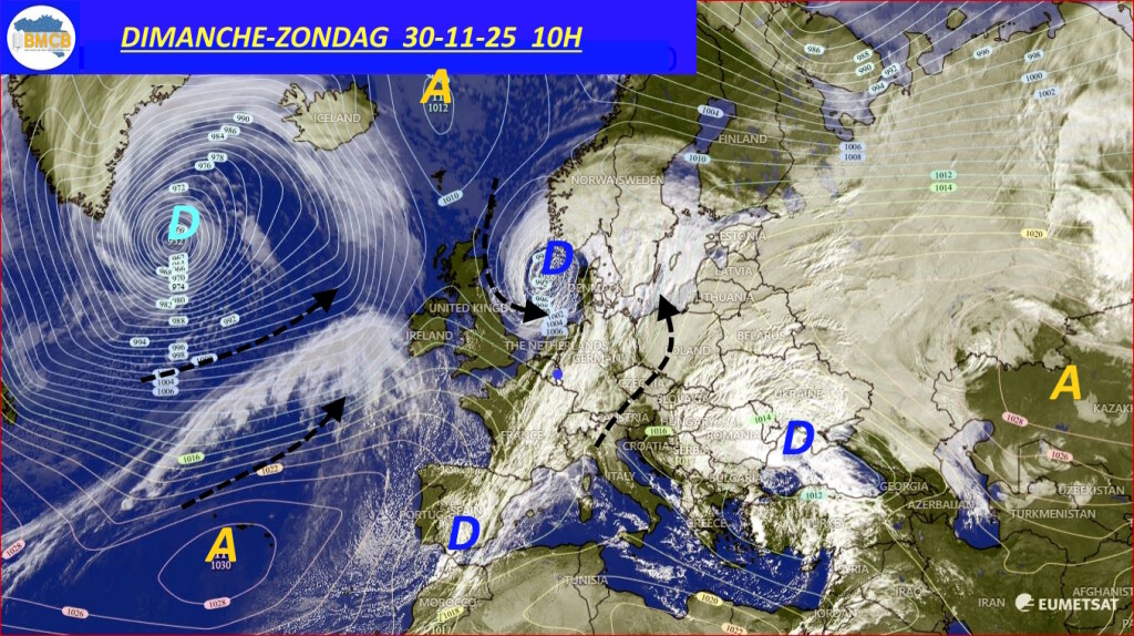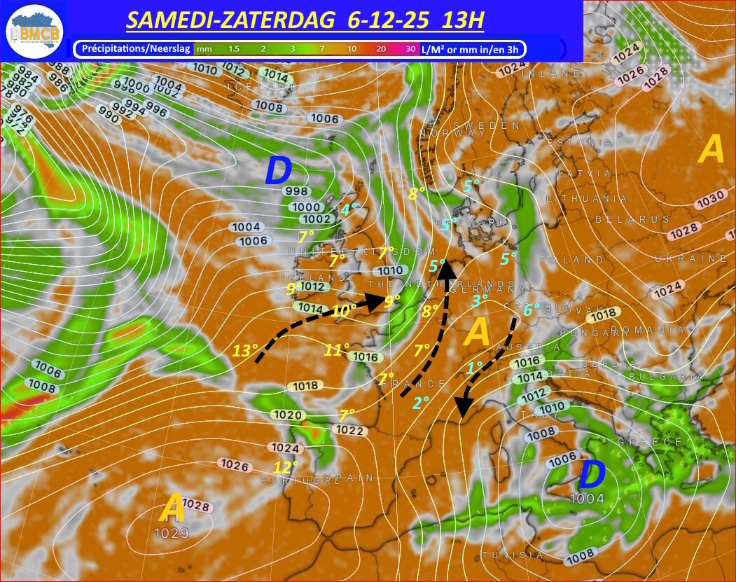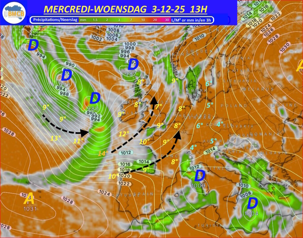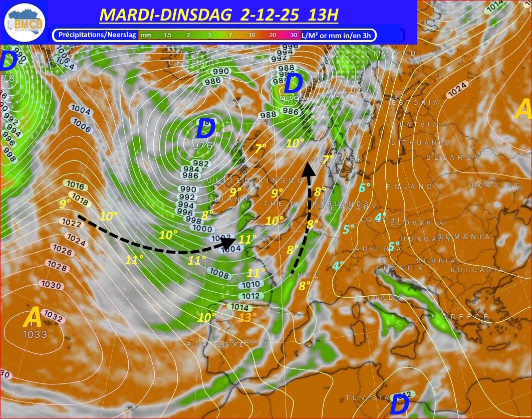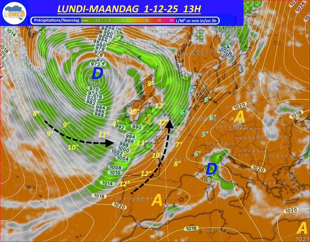 Morgen, maandag, bereiken nieuwe regenzones Bretagne, Het Kanaal en het westen van het land. Ze zullen vervolgens sterk verzwakt over België trekken, waarna een vrij zachte zuidelijke stroming zich installeert. Deze zachtere lucht wordt aangevoerd door een uitgestrekt lagedrukgebied van 964 tot 976 hPa, dat begin volgende week tussen het zuiden van IJsland en het westen van Schotland door schuift.