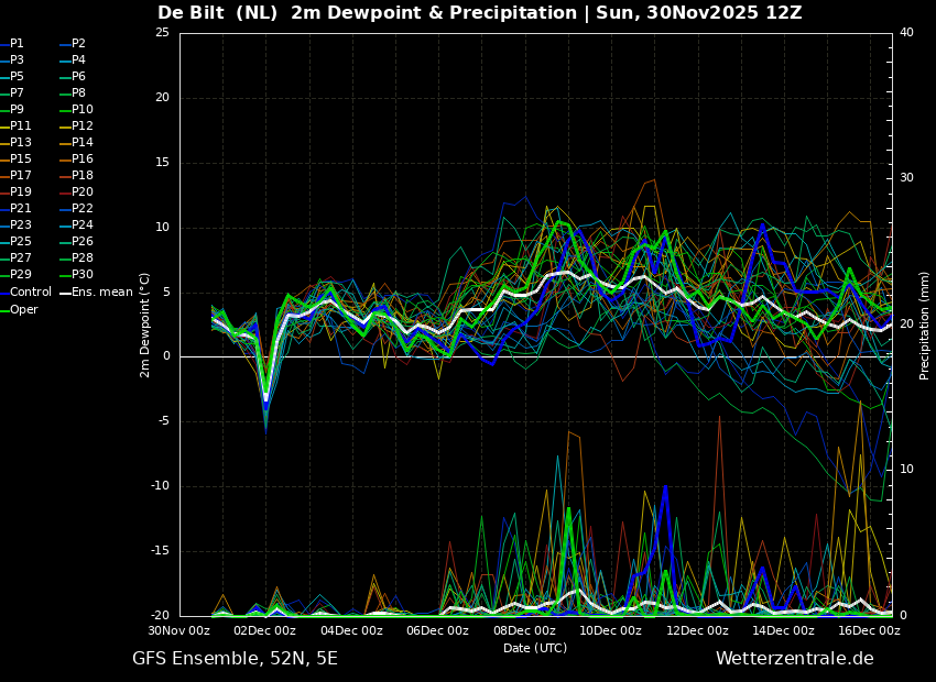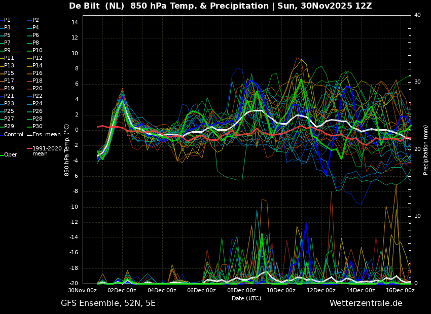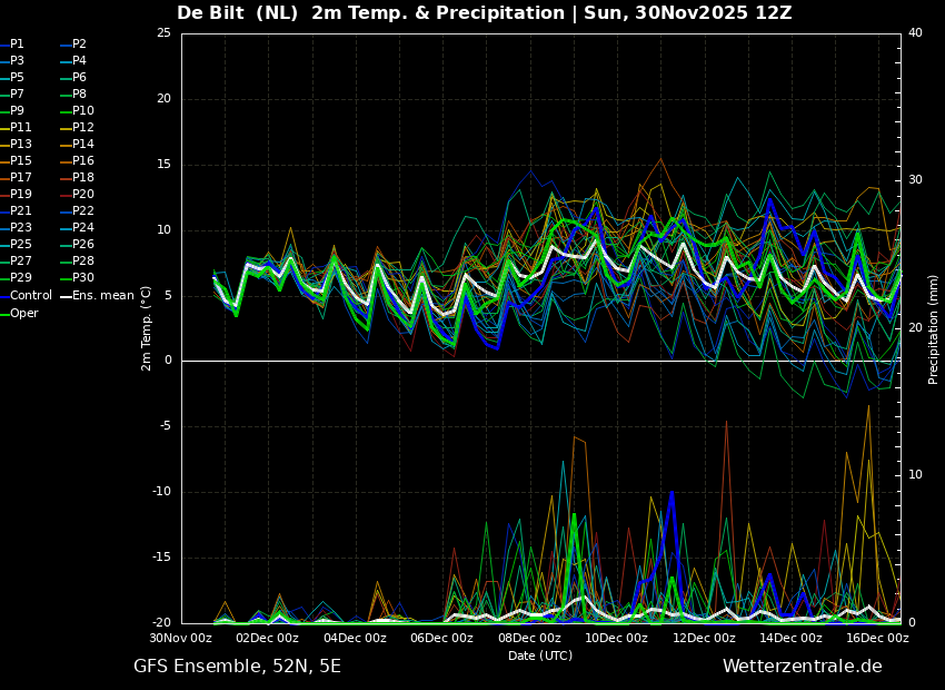 Tot aan 6 december zijn er geringe neerslagkansen en vanaf dan lijkt een volgende wisselvallige periode aanstaande, zonder dat direct tot veel neerslag zal leiden (9 december is mogelijk een uitzondering hier op).