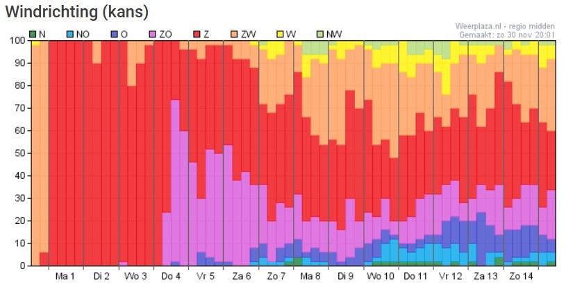 Bij ons betekent het een continue aanvoer van lucht uit richtingen tussen zuidwest en zuidoost. En die aanvoer brengt geen koude lucht binnen de landsgrenzen.