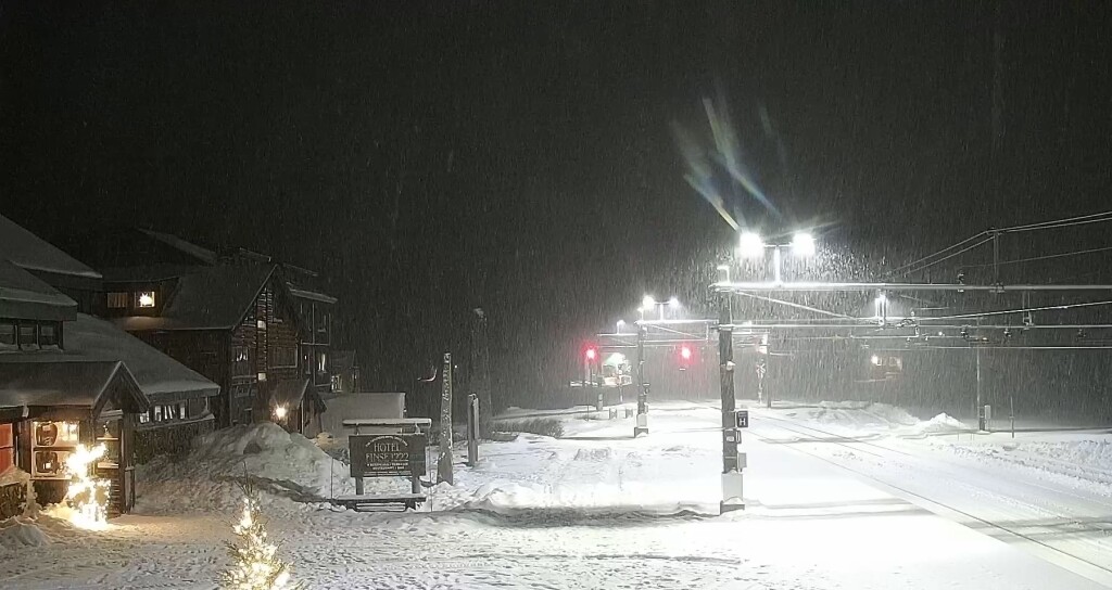Sfeertje in Finse. Sneeuw valt kaarsrecht naar beneden.
