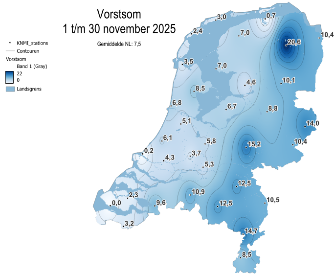 De meteorologische winter is vandaag van start gegaan! Hieronder een overzicht van de statistieken tot dusver behaald in november. Ell aan de leiding met een koudegetal van 1,1 en Eelde aan de leiding met een vorstsom van 20,6 en de laagste temperatuur tot nu toe: -5,4 graden.