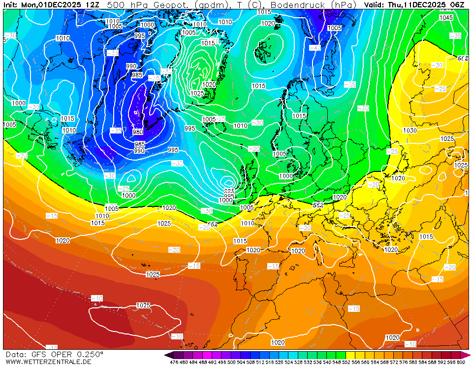 Op zich geen slechte grootschalige configuratie, een hoog bijna in het verboden gebied, kou stroomt aan de oostflank richting Scandinavië. Nu nog een serieuze WA op de oceaan installeren en we kunnen aan meer beginnen denken. Helaas wijkt de run wel redelijk wat af van de voorgaande, dus kans bestaat dat het straks weer anders is.