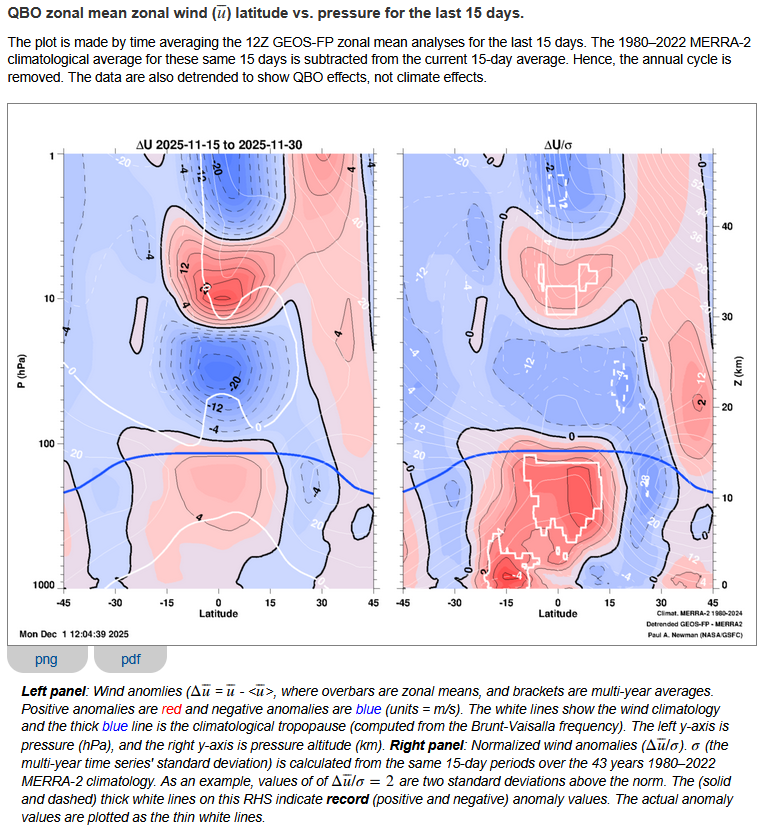 Toevallig of niet, er is sprake van een record sterke westelijke wind (QBO) bovenin de tropische stratosfeer (rechter paneel, witte dikke lijnen in het roodkleurige gebied rond >10 hPa). Deze zonale winden zijn op hogere breedte goed zichtbaar over het noordelijke halfrond en over de hele luchtkolom tussen 30 en 45° noorderbreedte. Deze afwijking is opvallend, temeer waar de data al gecorrigeerd is voor seizoenstrends. Ook is er sprake van record sterke zonale wind bovenin de troposfeer boven de evenaar. Of deze recordwaarden aan global warming zijn verbonden zou verder onderzoek behoeven.