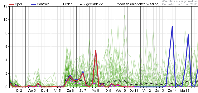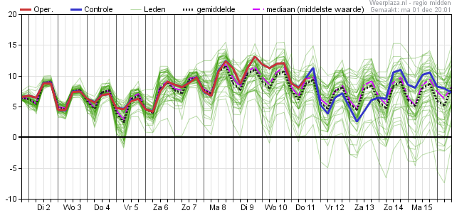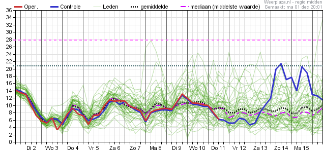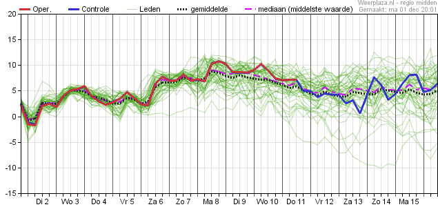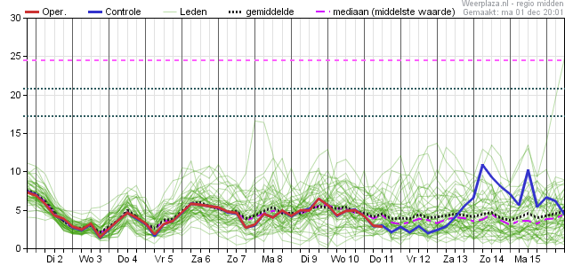 Volgende week maandag zou volgens deze pluim ze zachtste/warmste dag van de periode moeten gaan worden, met een maximum temperatuur rond de 12 graden, maar wel is er dan weer meer spreiding te zien.