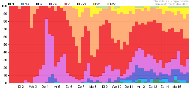 De windrichting ligt grofweg tussen zuidoost en zuidwest, met op veel dagen kans op een windrichting uit het zuiden.