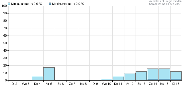 In de nacht van woensdag op donderdag en in die van donderdag op vrijdag is er enige kans op vorst, waarbij de kans het grootst (18%) in laatst genoemde nacht.