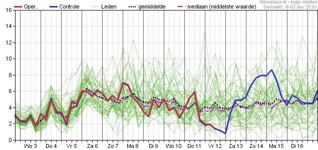 Net als bij GFS te zien is, voorziet ook ECMWF vanaf het weekend beduidend zachtere omstandigheden, maar voor het zover is, hebben we de komende drie dagen nog te maken met maxima die in de buurt van de normaal voor de tijd van het jaar liggen.