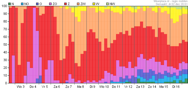 Qua windrichting is deze globaal gesproken tussen zuidoost en zuidwest, waarbij het tot halverwege de zaterdag tussen zuid-zuidwest en zuidoost zal zijn en in de periode daarna tussen zuidwest en zuid.