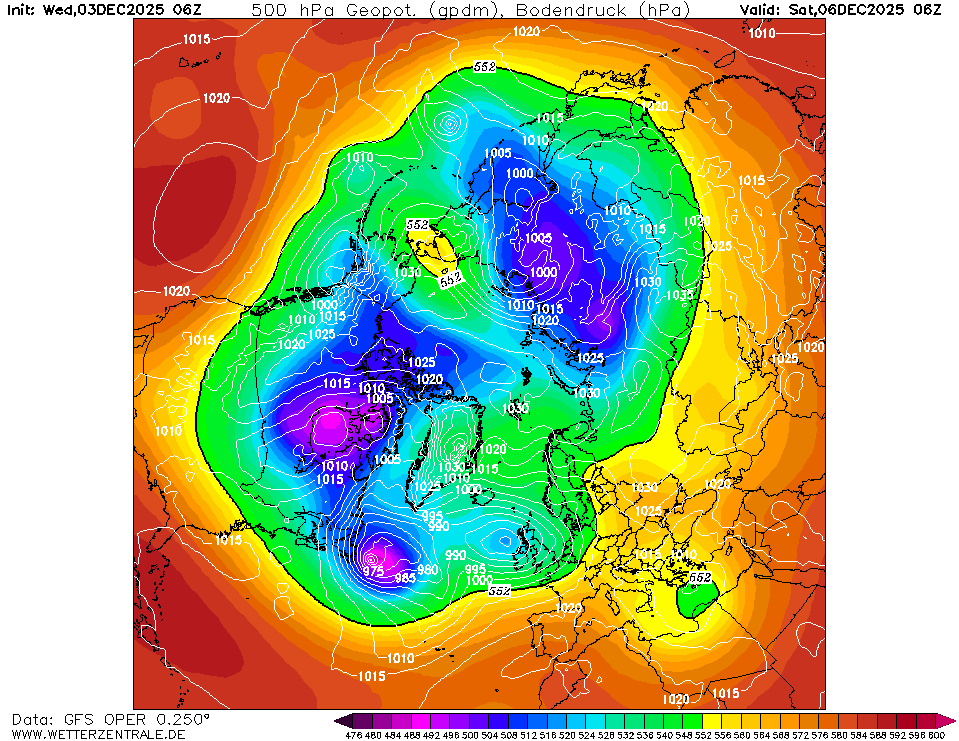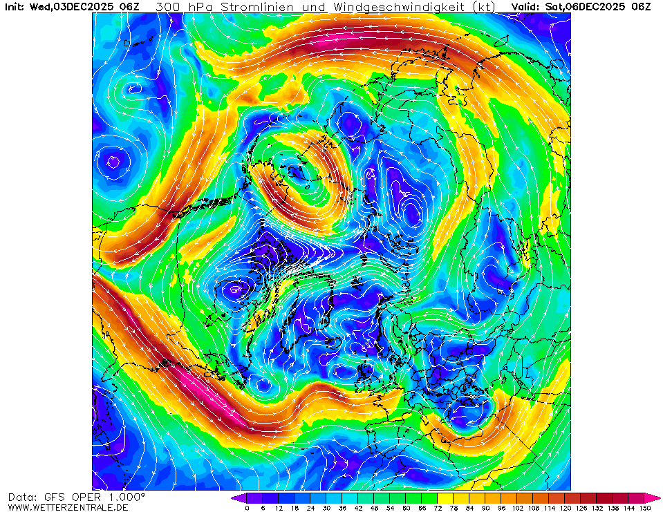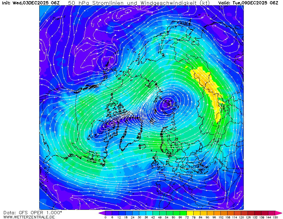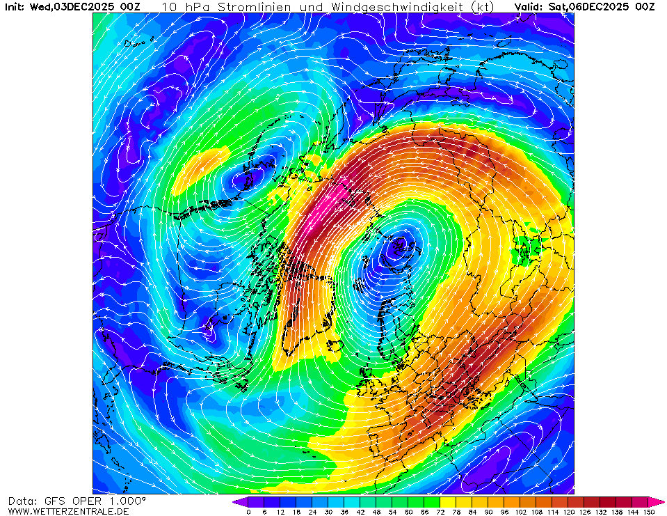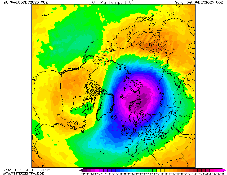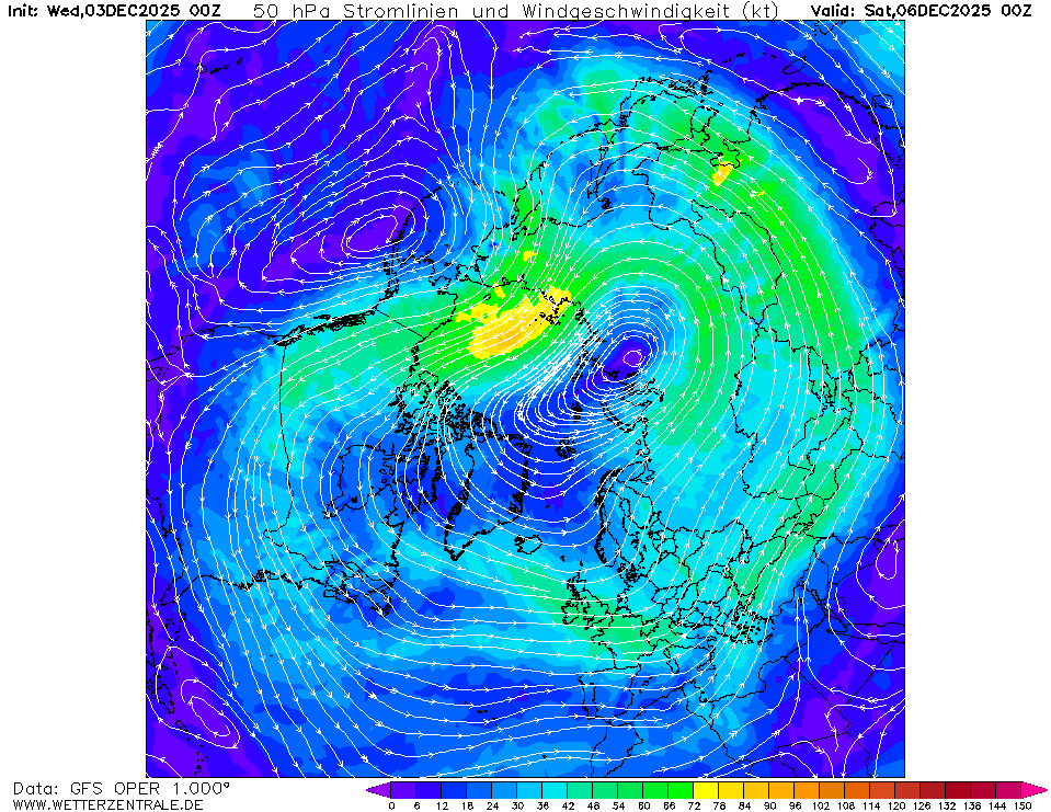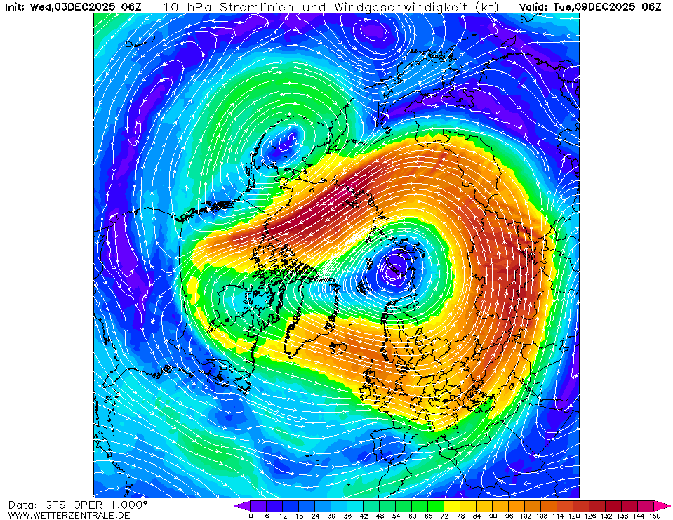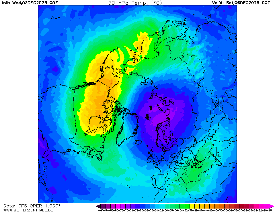 We kunnen nu ook kijken naar eventuele effecten op de troposfeer. Aan de andere kant van de pool, boven de Beringstraat snoert zich een hoog af. Deze ontstond uit een meander in de jet opgepord door WA vanaf een depressie bij Japan. Maar het is niet toevallig dat deze zich onder het stratosferische hoog zo goed kan ontwikkelen. Dat soort poolhogen bij Alaska zie vaak bij stratosferische opwarming, echter zonder hulp vanuit de stratosfeer kunnen ook wel eens hogen afsnoeren. Voor ons is het interessant Groenland in de gaten te houden en inderdaad de wetterzentrale kaarten kleuren daar mooi groen op 500hPa. Maar er lijkt geen steun vanuit de stratosfeer want die is koud en laag in dat gebied en dat lijkt ook te gelden voor de zuidelijker gelegen jet vanaf Amerika.