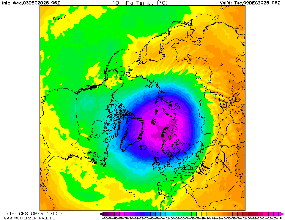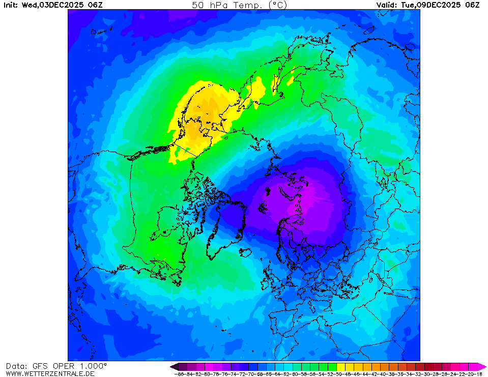Volgende de stratosfeer tot 6 dagen vooruit dan zien we dat vortex weer wordt uitgetrokken over Canada. De Siberische opwarming op 10hPa dooft verder uit en het koude vat schuift wat op richting pool/Groenland. Boven Canada koelt het op beide niveaus af en op 50hPa vloeit er bovendien restwarmte uit over de Atlantische Oceaan. Maar dit kan ook te maken hebben met de Canadese koudepoel. Dan warmt de stratosfeer op omdat die naar beneden wordt getrokken door een onderliggende koudeput.