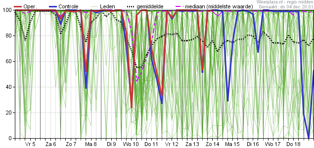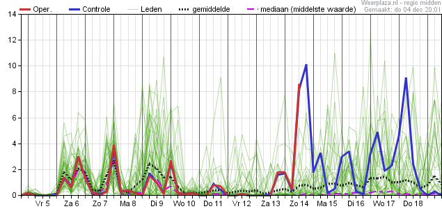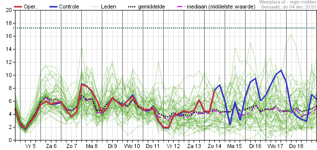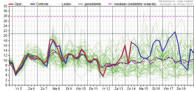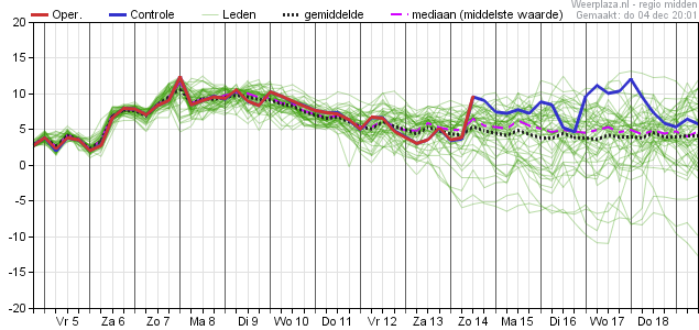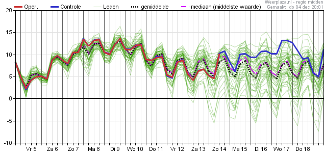 Daarbij de aantekening dat vanaf die vrijdag de spreiding steeds verder toeneemt, waardoor er in de eerste dagen van de week daar op (maandag 15 december en verder) de waarden uiteenlopen van zo'n -2 graden aan de onderkant tot zijn 12 a 13 graden aan de bovenkant.