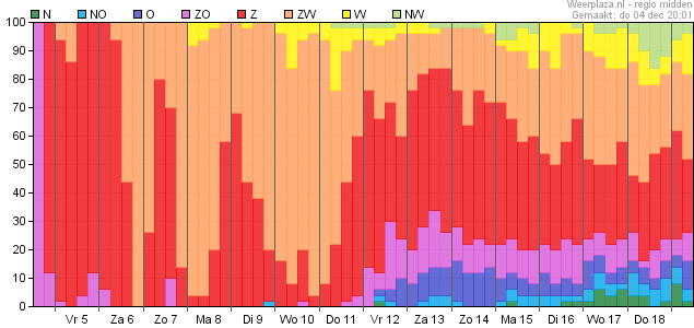 Ook qua windrichting zie je een toenemende spreiding, welke begint op donderdag 11 december en dan steeds veder toeneemt om uiteindelijk op donderdag 18 december mogelijkheden te geven tussen oost en noordwest.