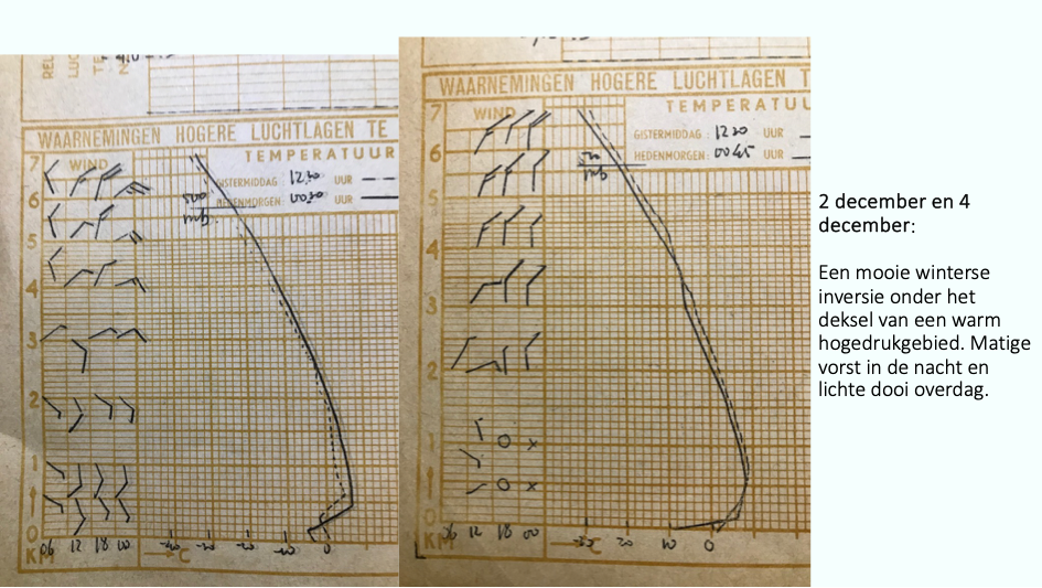 Hieronder een fragment uit mijn Dagboek 1963. Daarna de registratie waarin de inversie mooi te zien is. Daaronder de weerkaart (een echte weerkaart) van 5 december om 13 uur (MET).