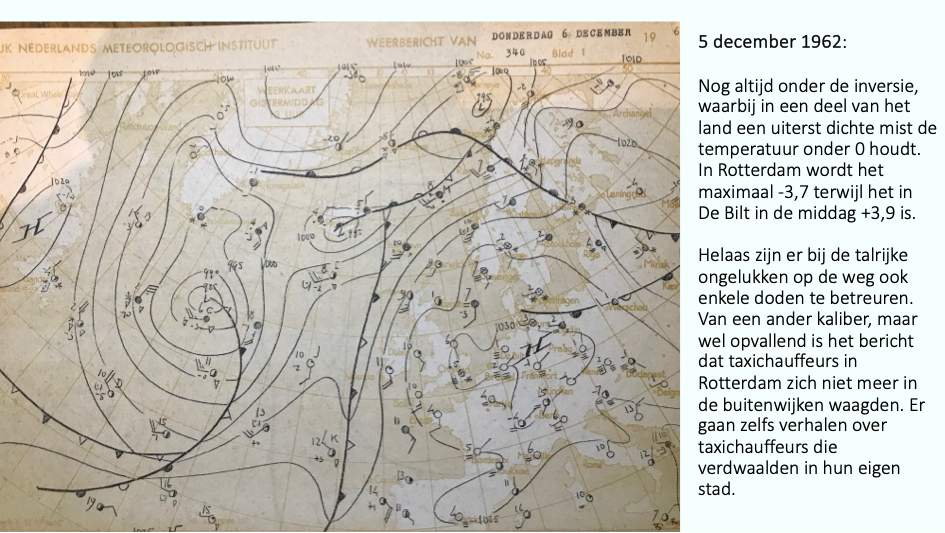 . Het autoverkeer op één van de drukste wegen ter plaatse ging stapvoets, schuifelend bijna in een ondoordringbare mist. Bovendien was de weg spekglad geworden door de mistaanslag. Ik kan me geen dichtere mist herinneren en dat moet ook gelden voor sommige taxichauffeurs in Rotterdam, die in hun eigen stad de weg kwijt raakten. Geruchten gaan over een zicht van 10 meter! Het bleef vrijwel windstil die dag. Na het uitpakken van de sinterklaascadeaux keken we uit het raam van de woonkamer, dat mooi uitzicht gaf over een sportveld. Verbazing : maanlicht, prachtige rijp op het gras, het is dus weer opgeklaard. Wat een veranderingen, terwijl er toch geen wind staat!? Ik zie absoluut windstil weer op de registratie van De Bilt van 4 december 16 uur tot 6 december om 10 uur. Het vriest die nacht weer 10 graden; het KNMI verklaart het fenomeen met de volgende zin : "door een geringe verplaatsing van het hogedrukgebied boven midden-Europa stroomde met zwakke winden weer iets drogere lucht ons land binnen."