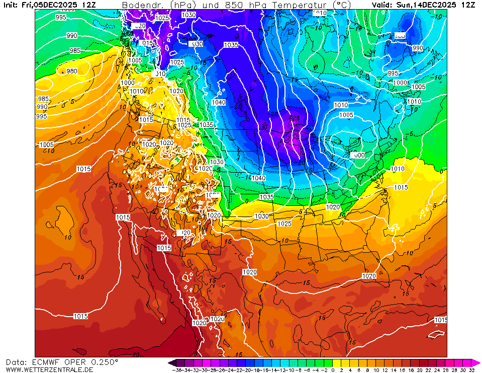 Kijk eens naar North Dakota. Hoe extreem het temp gradient is en hoe de bittere kou uiteindelijk de staat verovert (in 24 uur!). Verder naar het oosten en zuidoost (Great Lakes) flinke sneeuw storingen zo nu en dan. Zal weer bizarre beelden op gaan leveren, vanuit ons perspectief.