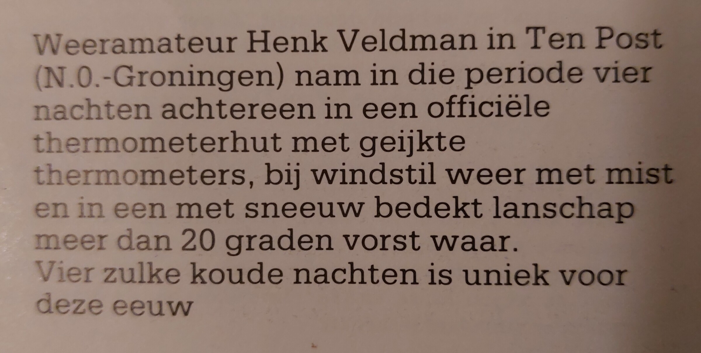 Vier dagen op rij beneden - 20° lijkt mij een record. Ik baal dat ik toen nog geen goede thermometer had. Ben in 1980 begonnen met waarnemen en heb de - 20° nog nooit een keer kunnen noteren.