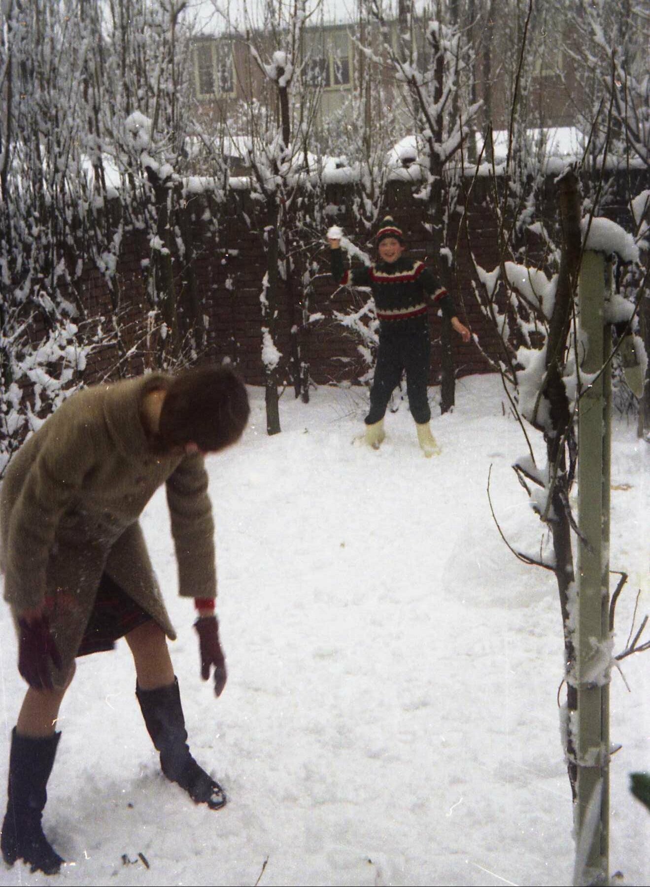 Ik heb hier een foto van januari 1969 bij mij vroeger thuis in de achtertuin, 2 van mijn zussen aan het sneeuwballen gooien.