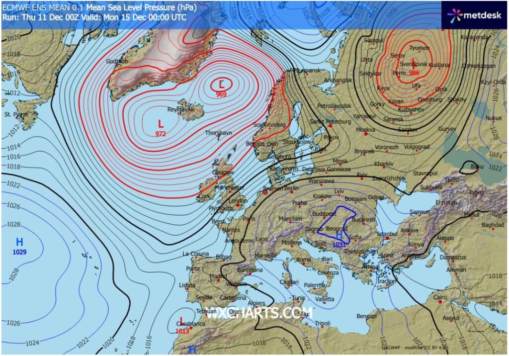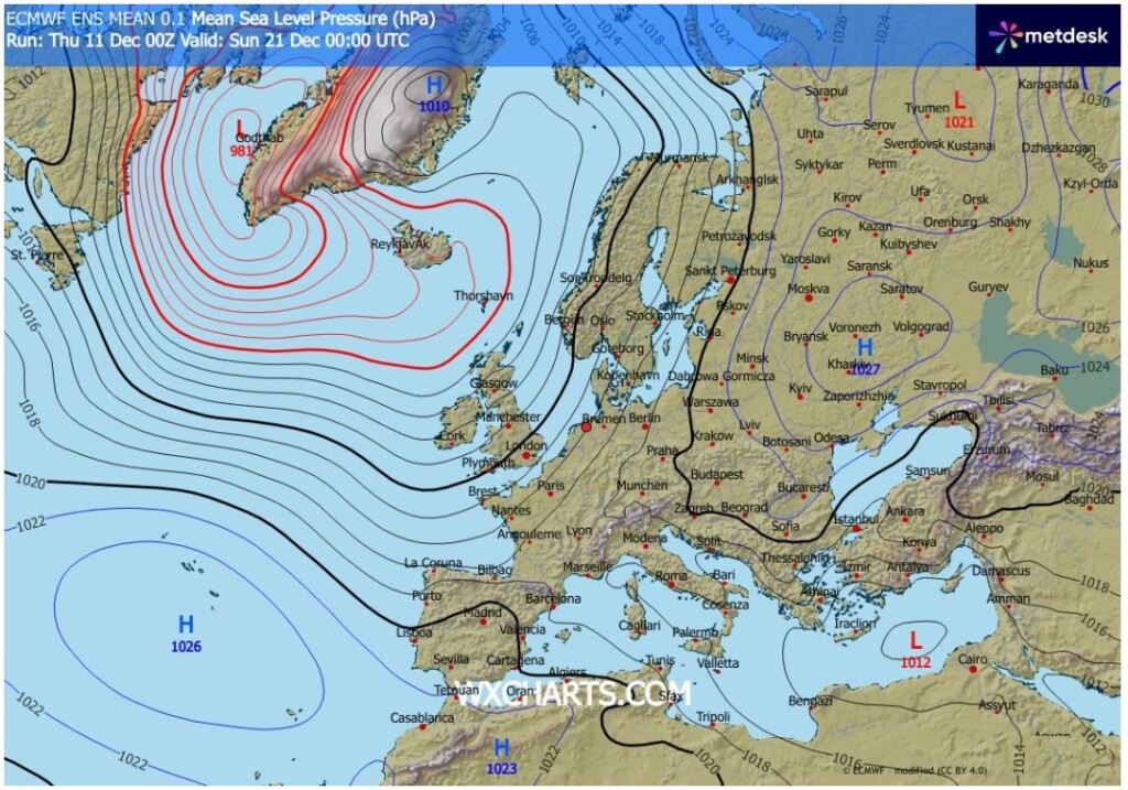 We zitten voorlopig vast aan een standvastige drukverdeling. Gedurende de komende 10 dagen zal het hoog ten zuidoosten bivakkeren en het laag ten noordwesten. Daarbij lijkt de invloed van het hoog iets groter te zijn dan de invloed van het laag wat resulteert in weinig neerslag en geregeld wat zon. Diepe depressiekernen zijn te vinden ten zuiden van Groenland en boven IJsland. De kerndruk kan tijdelijk beneden de 950 hPa uitkomen.