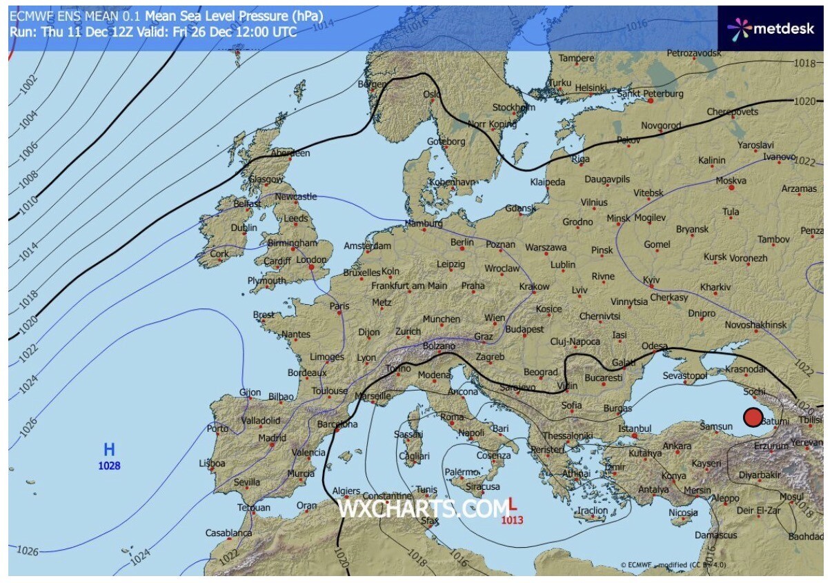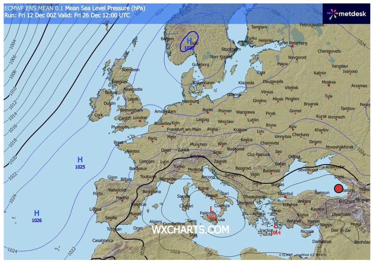 In de 12z van gisteren liet het gemiddelde eigenlijk gewoon een Azorenhoog zien met een uitloper naar onze omgeving, maar nu zien we de hogedruk ten noorden van ons, in Zuid-Scandinavië.