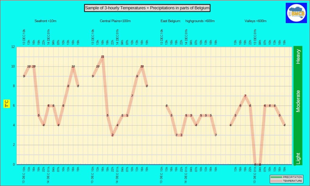 Maxima: rond 10°C aan zee, 8–11°C landinwaarts en 5–7°C in de Hoge Ardennen.