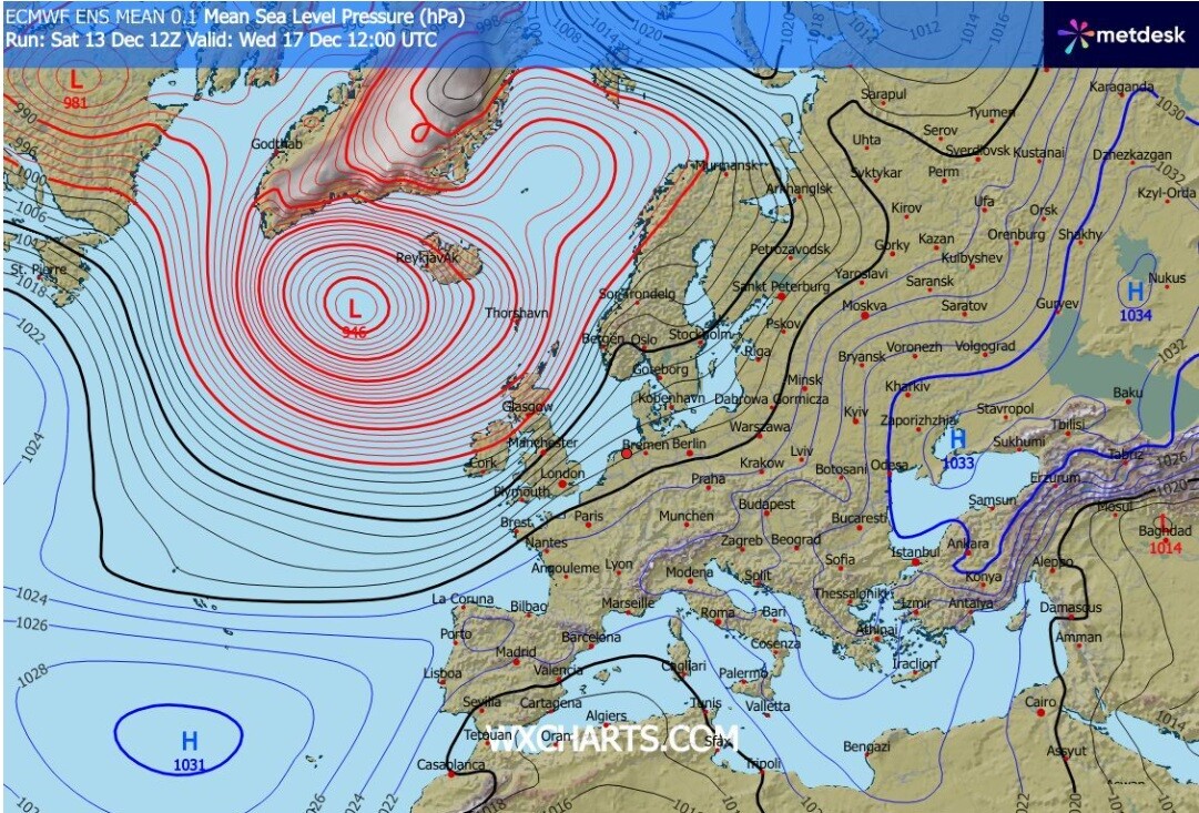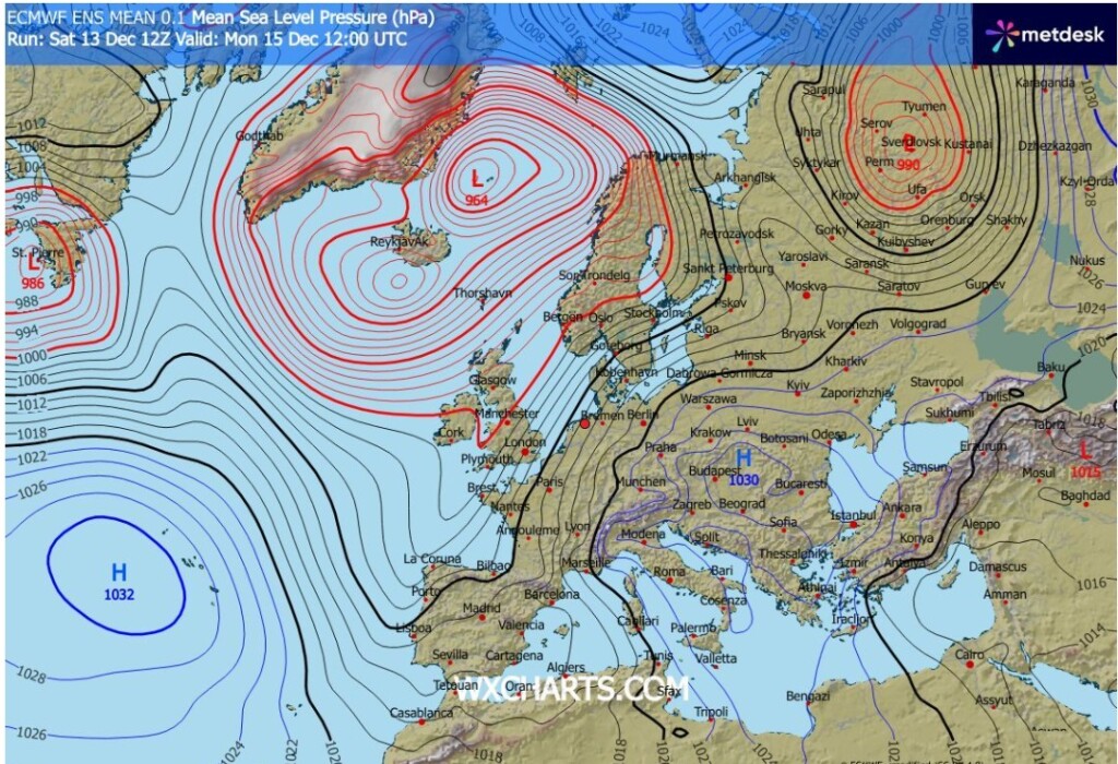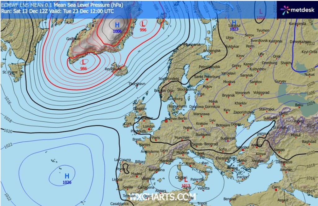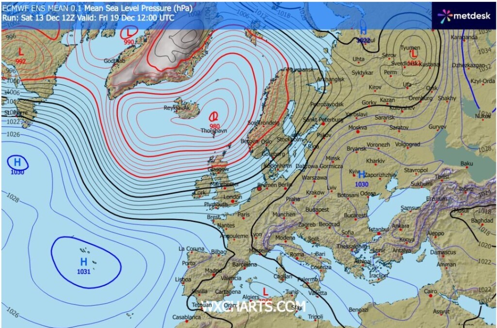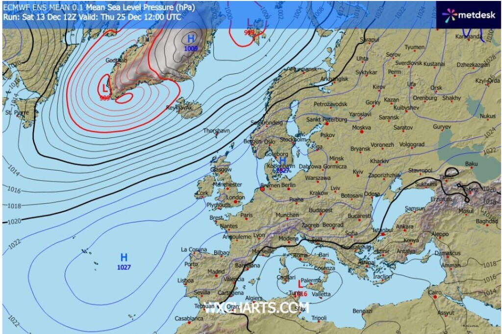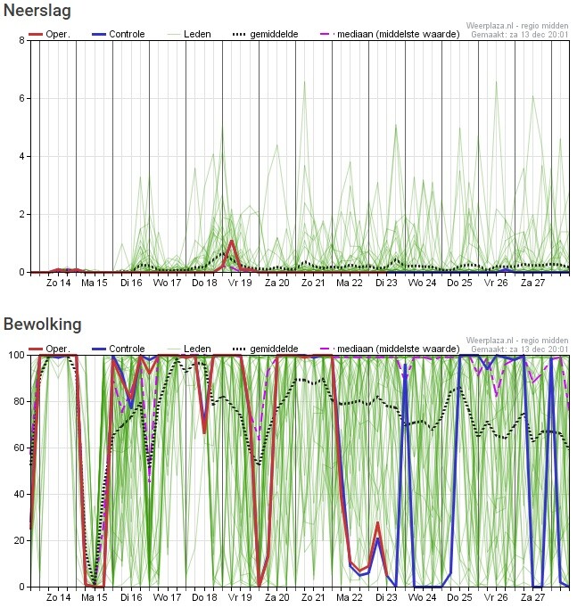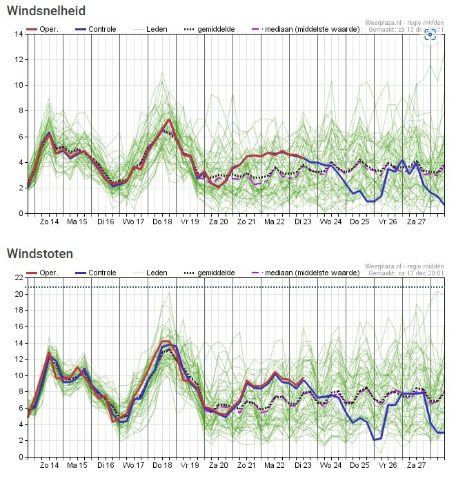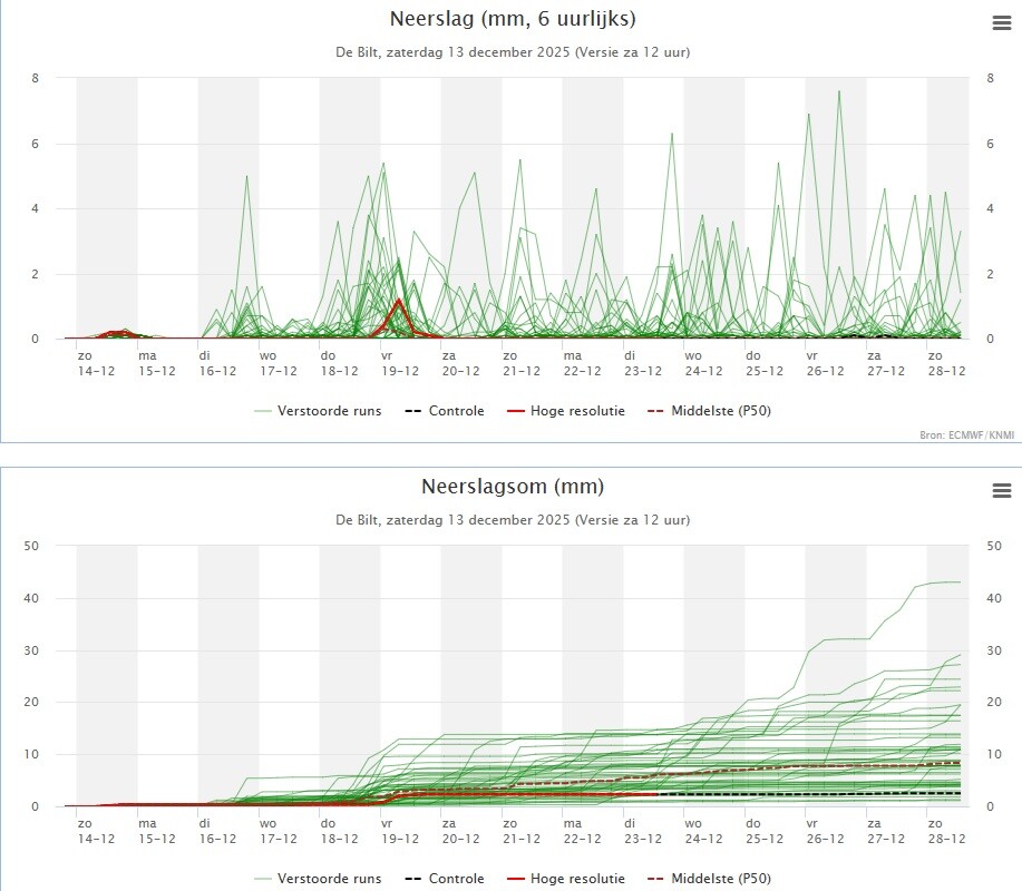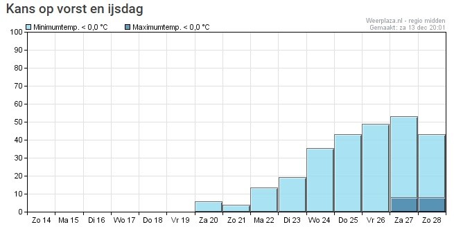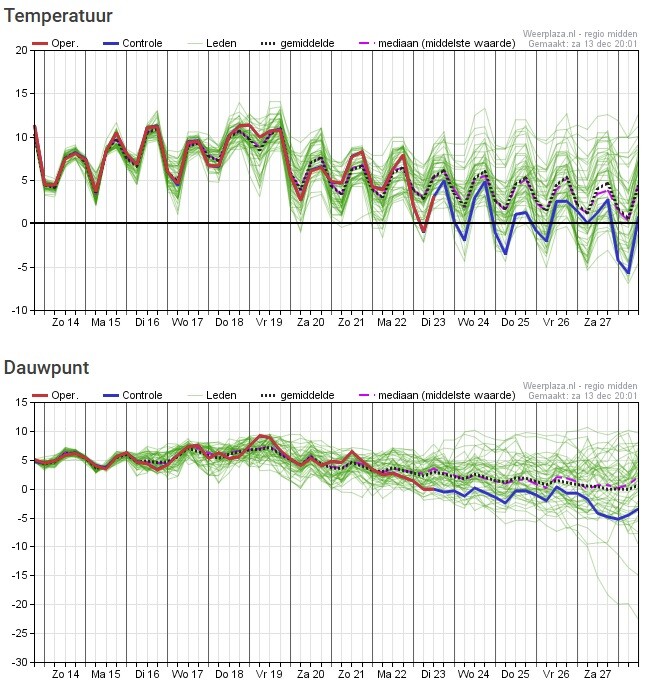 De temperaturen liggen tot en met de 19e nog boven het langjarig gemiddelde. Daarna dalen de temperaturen geleidelijk richting kerst. De control laat het gedurende de kerst helemaal winters zijn met temperaturen die maar amper boven het vriespunt uitkomen, ook overdag. In de derde decade zien we ook een duidelijke toename in kansen op vorstdagen.