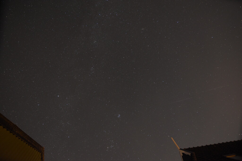 Heb een stuk of 20 meteoren in 3 kwartier gezien en maar een paar op de foto gekregen. Ik moest de strijd staken omdat er condens op de lens kwam, het is erg vochtig.