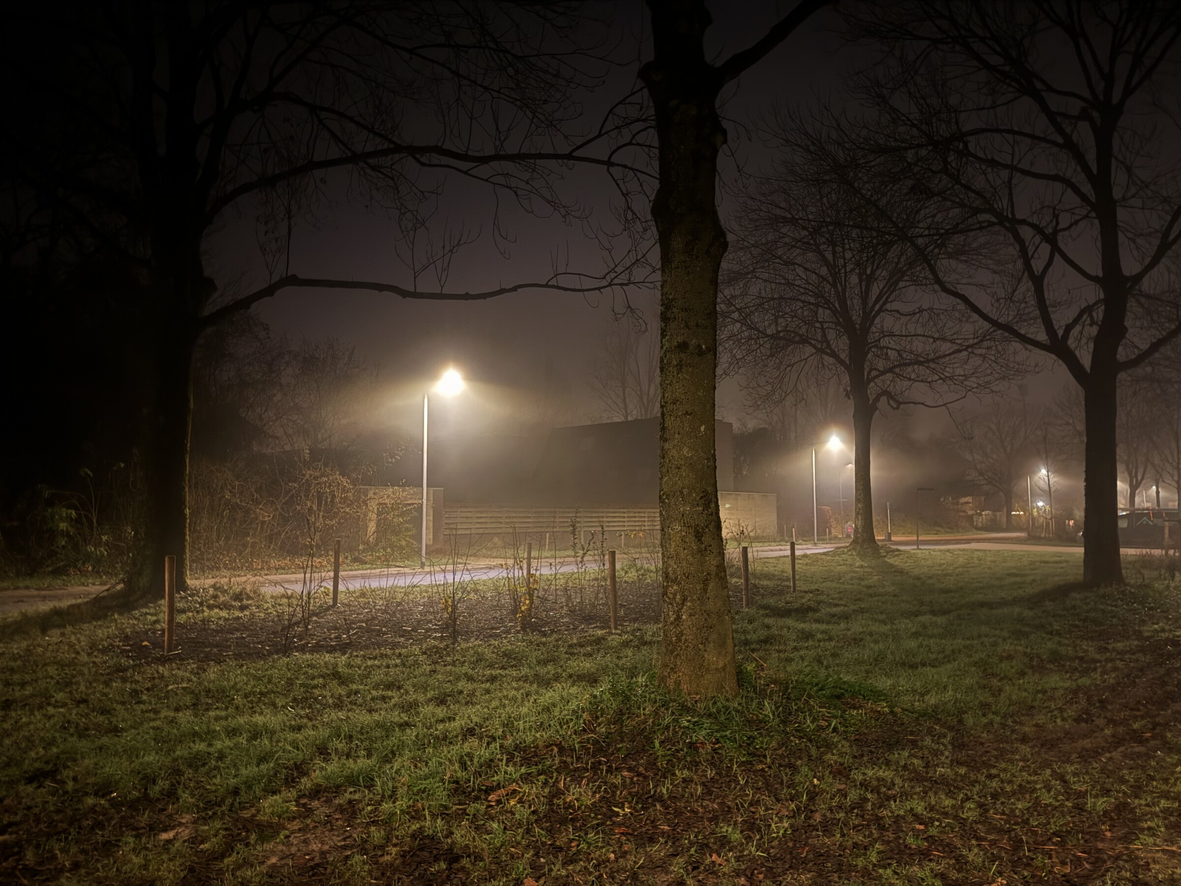 Deze foto heb ik gemaakt maar het komt eigenlijk niet over (je ziet dat de mist aan de bovenkant van de lantaarns zit)