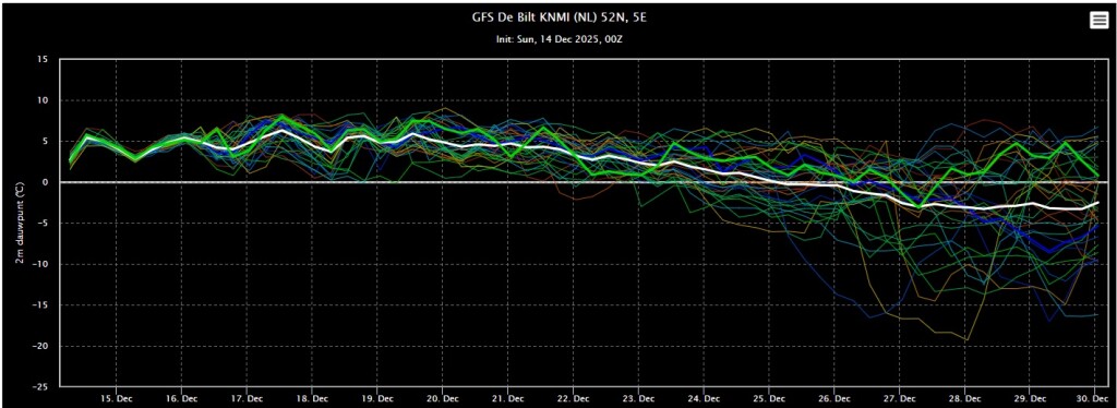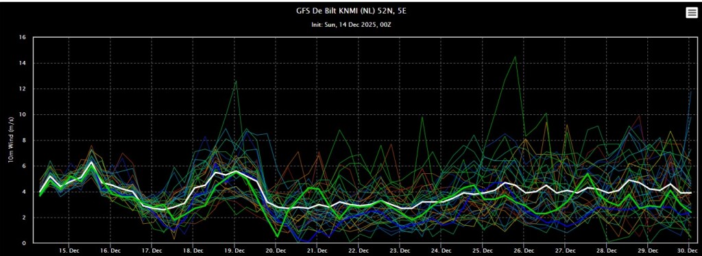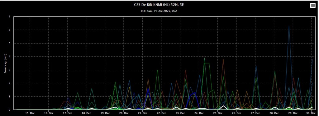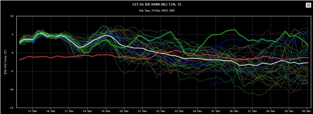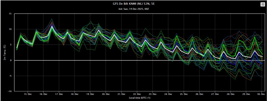 Een mooie geleidelijke daling van de temperatuur de komende tijd. Daarbij niet veel neerslag en geregeld de zon. Soms veel wind.