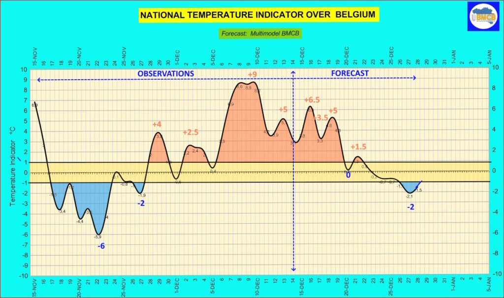 Vanaf 20 december wordt een geleidelijke weersverandering verwacht. De nationale thermische index zou dan eerder tussen +2 en -2 schommelen. Dit komt overeen met dagtemperaturen van 0 tot 6°C tijdens de koudste dagen en van 3 tot 9°C tijdens de zachtere fasen.