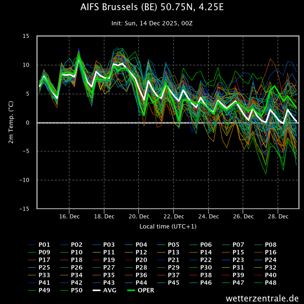 Vanaf volgende week zaterdag een daling richting normale en voor het gevoel frisse temperaturen tijdens de kerstweek tot iets boven nul richting het laaste weekend van 2025. Zoals het er nu naar uitziet niet de bekende kerstdepressie met regen/wind en dubbele cijfers tijdens de kerstdagen.