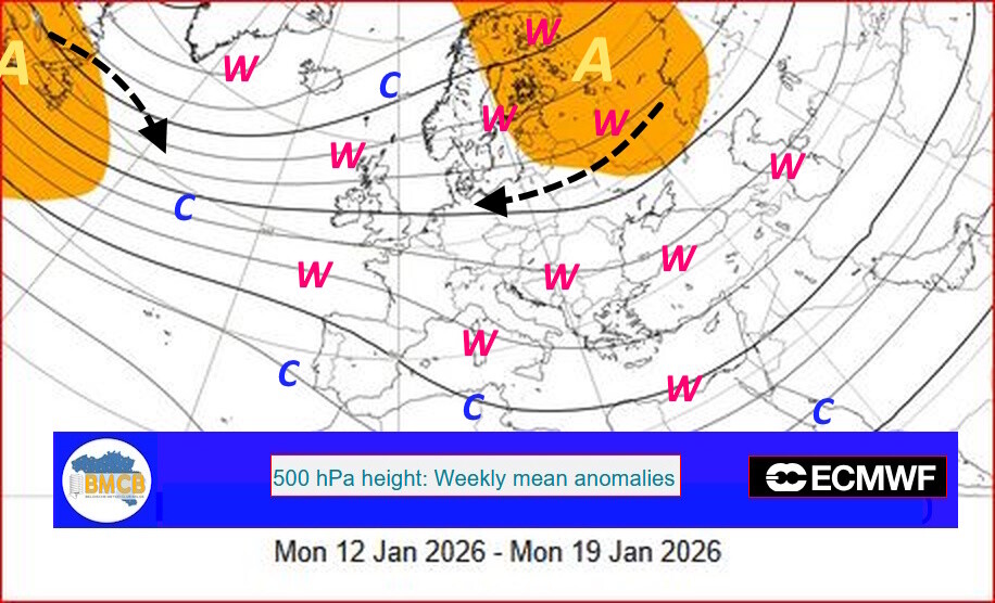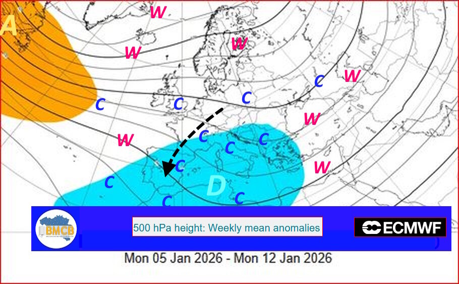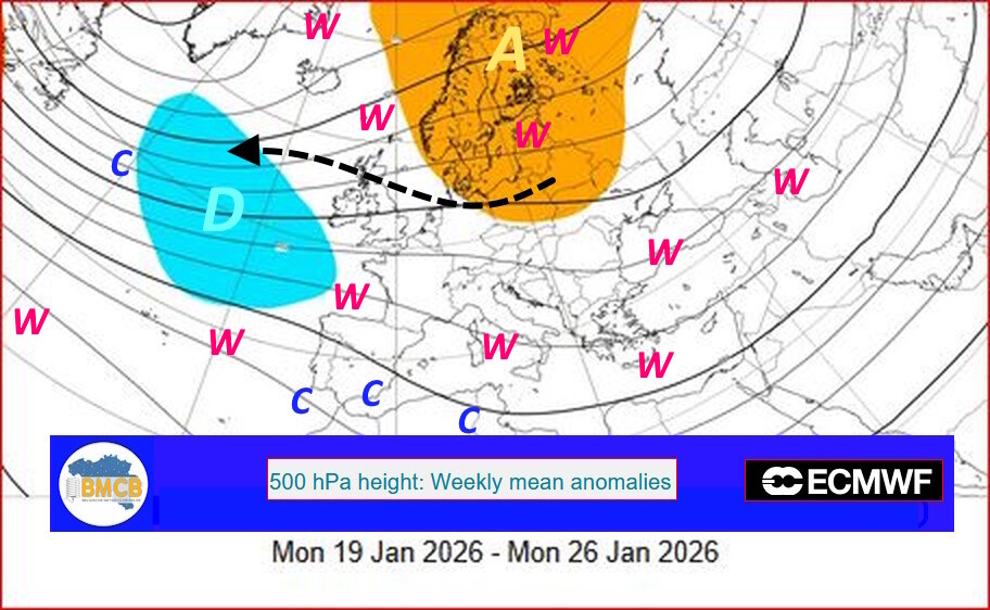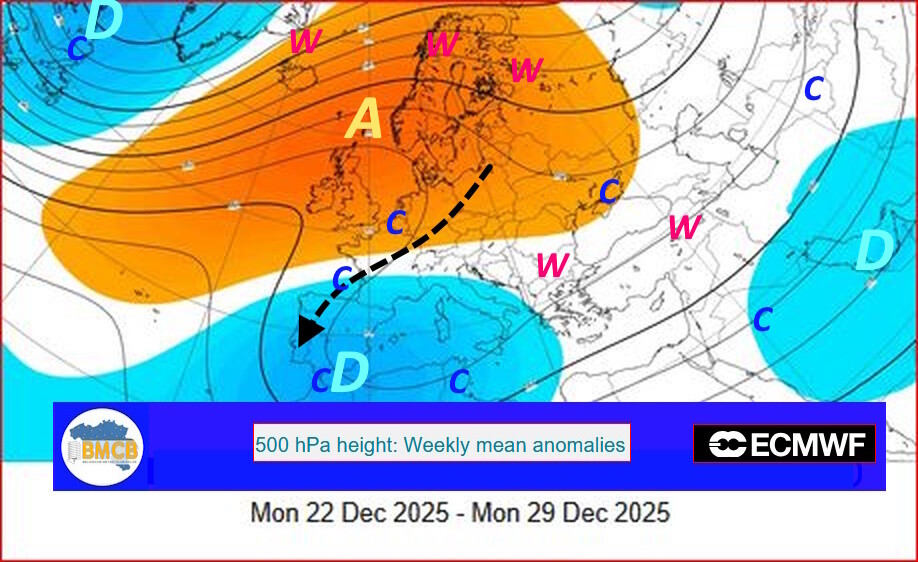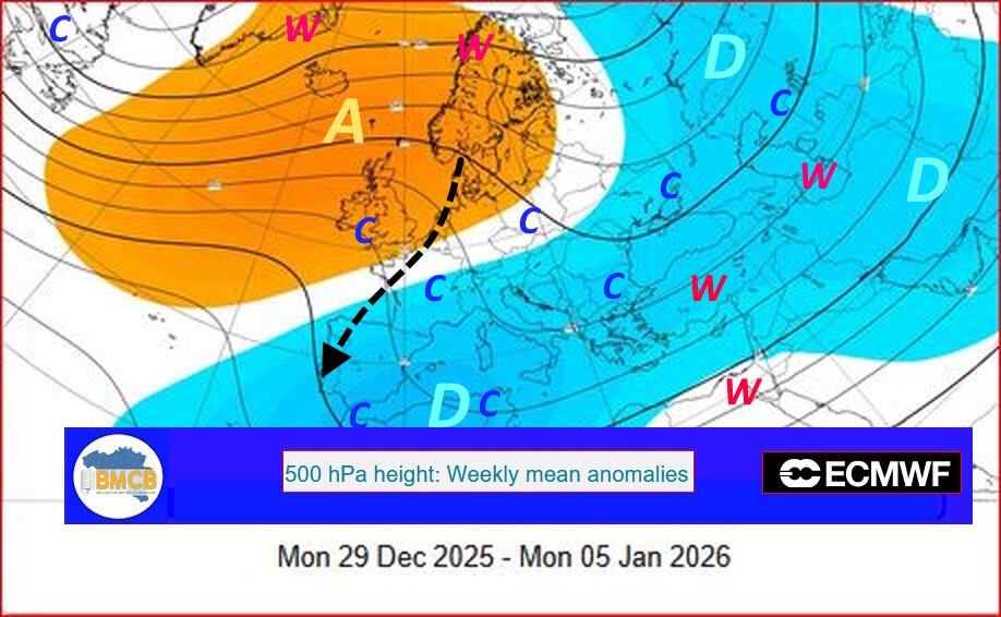 Tussen 22 december en 25 januari blijven de ensembles wijzen op het aanhouden van een uitgesproken anticyclonale anomalie die zich uitstrekt van de Atlantische Oceaan tot Scandinavië, terwijl een aanhoudend lagedrukgebied zich zou uitstrekken van het Iberisch Schiereiland tot de Balkan en Rusland.