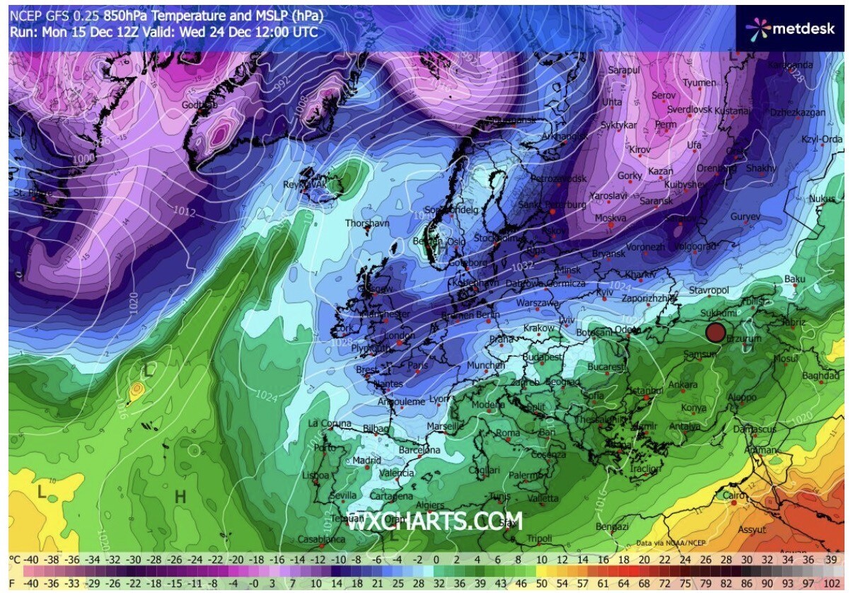Op WXCharts loopt de run wel verder. In deze run kan er wel wat transportkou de Benelux bereiken. Heel spannend is het echter niet, de temperatuur komt overdag nog uit rond 3-4 graden, op Eerste Kerstdag een graad of 2.