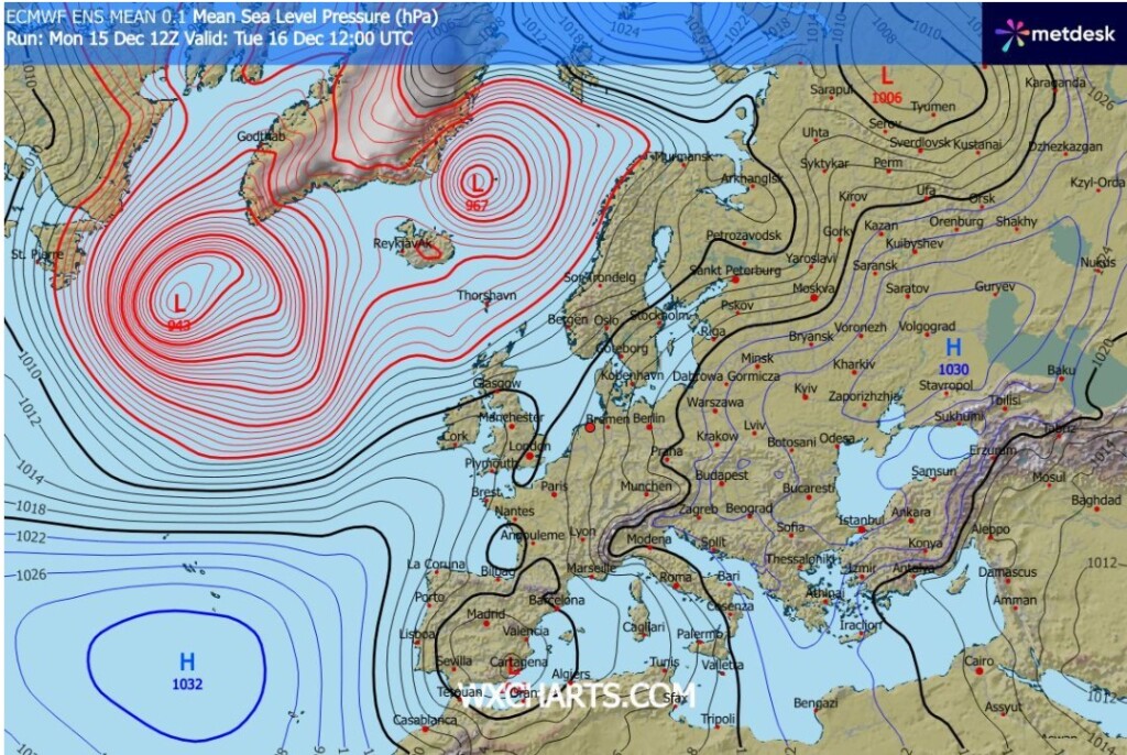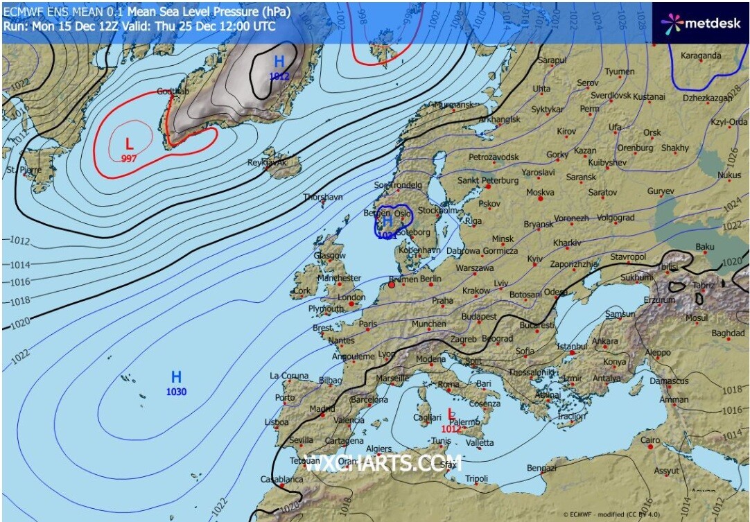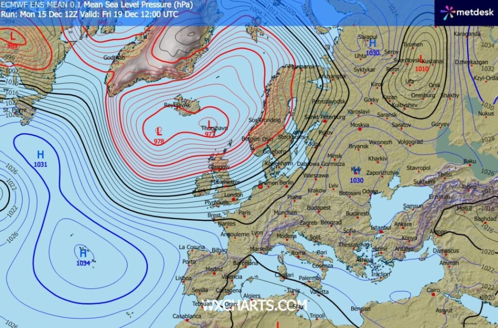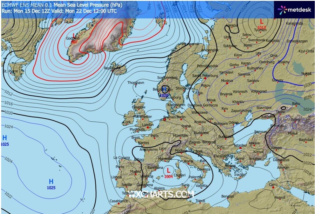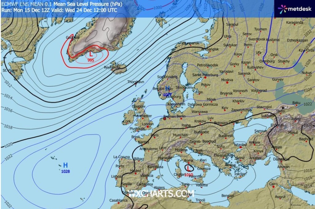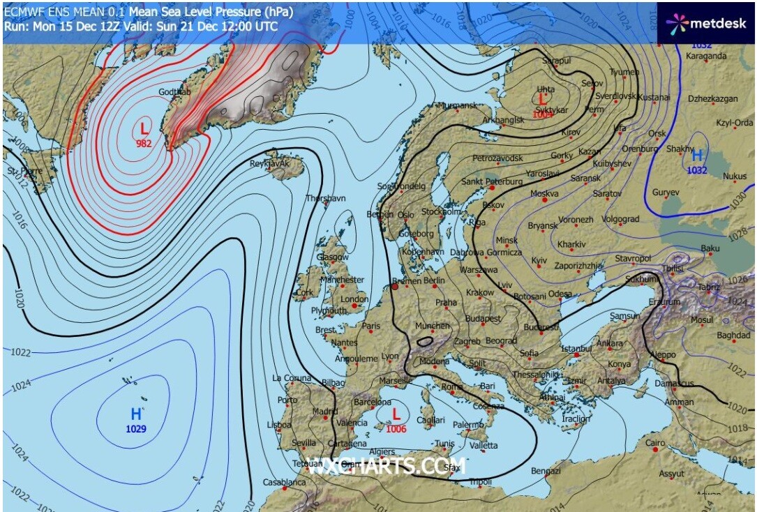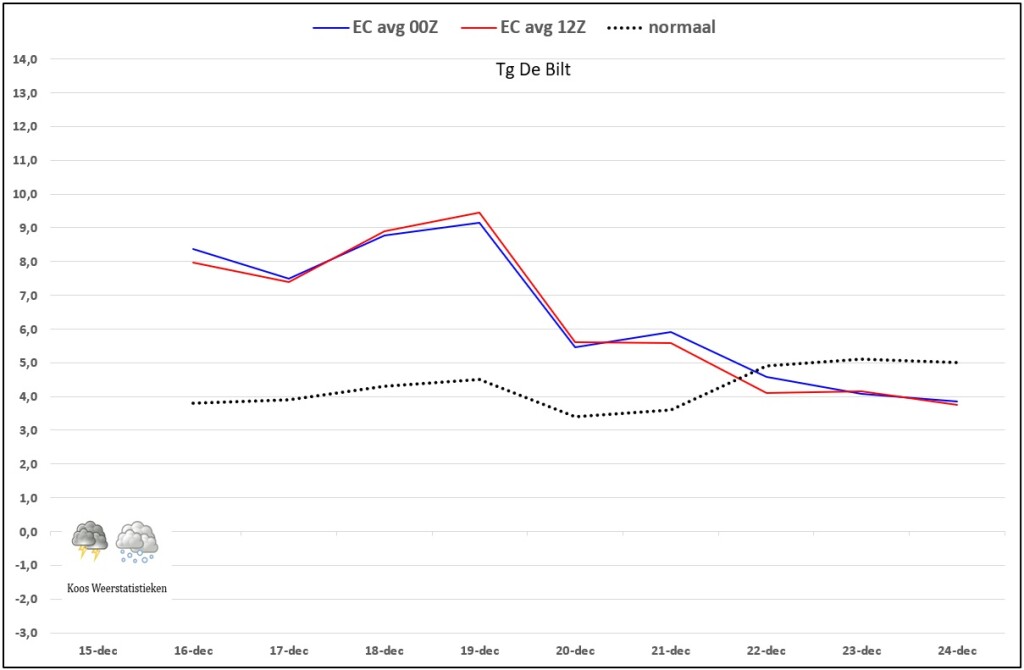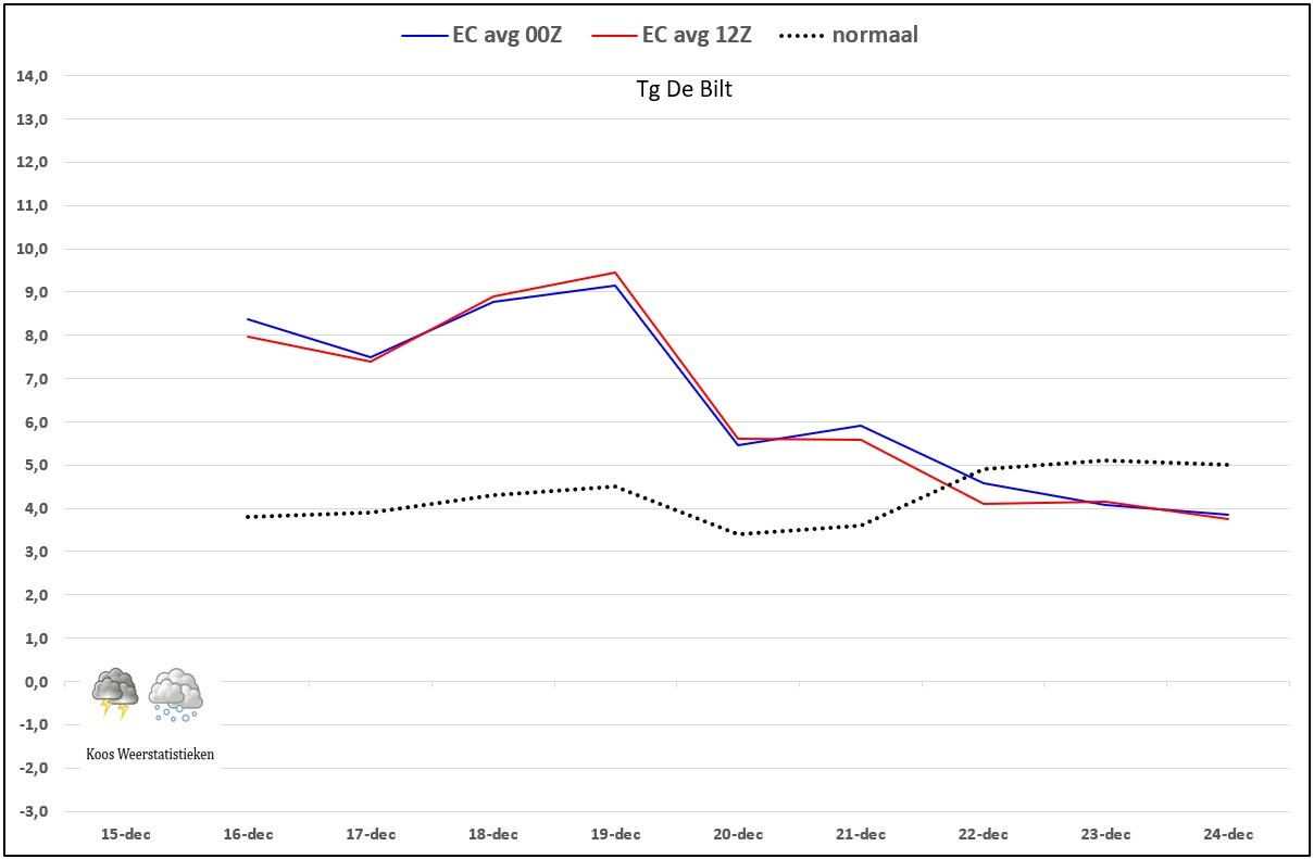 De transitie van een NAO+ regime naar een geblokkeerd regime is heel mooi zichtbaar in de overzichtskaarten voor de komende 10 dagen. Het geblokkeerde patroon zal ons uiteindelijk in een noordoostelijke stroming brengen. Winterkou zit er in deze stroming de eerstkomende 10 dagen niet aan. In de aanvoerrichting is simpelweg geen kou aanwezig. Bijkomende factor is de zeewatertemperatuur van de Oostzee in de aanvoerrichting. Wanneer er uiteindelijk wel kou op transport wordt gezet, dan kan dat een factor van belang worden. De koude lucht neemt dan vocht op boven de Oostzee en dat resulteert bij ons in wolkenvelden met temperaturen zowel in de nacht als overdag tussen 0 en 5 °C