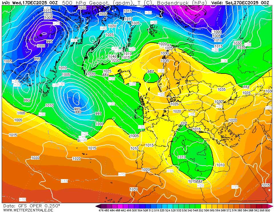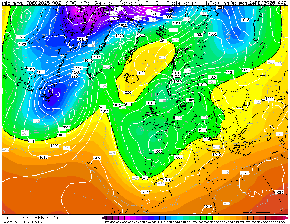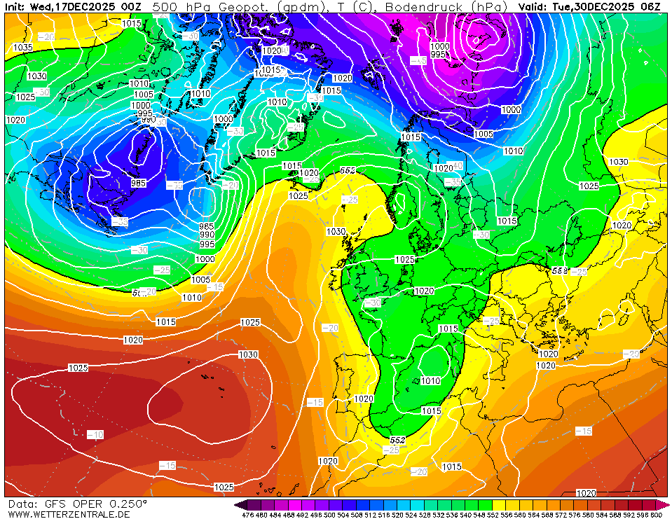 Rond 300+ zie je wederom dat er een hoog richting Groenland mogelijk is en dat er een kou uitstroom vanuit het noorden kan plaatsvinden. Dit kan tegen het einde van het jaar vuil winterweer op gaan leveren.
