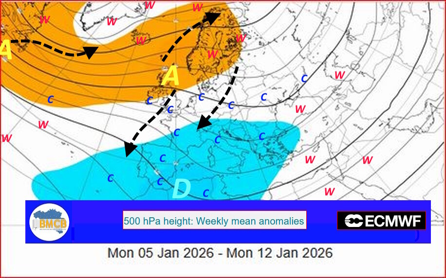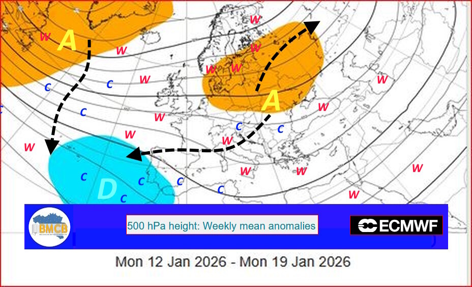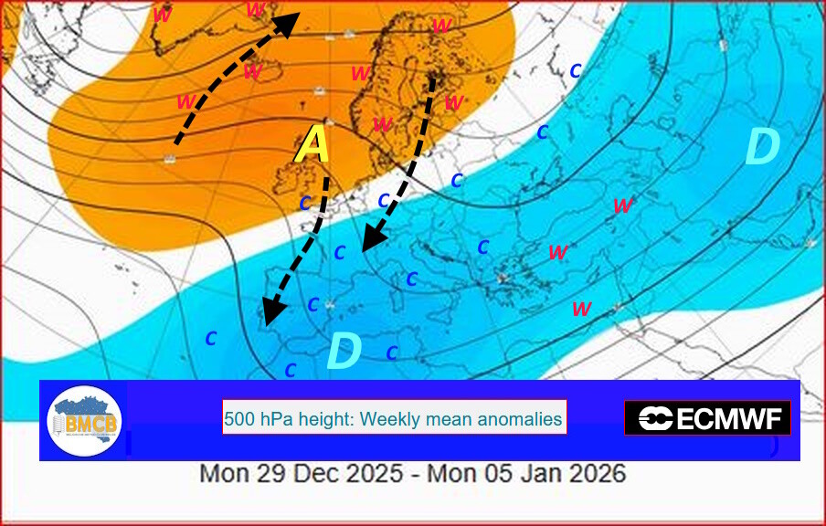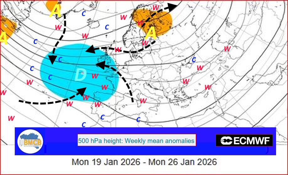 Het einde van december en de eerste helft van januari blijven waarschijnlijk gedomineerd door een uitgestrekt hogedrukgebied, dat zich uitstrekt van de Atlantische Oceaan tot Scandinavië.