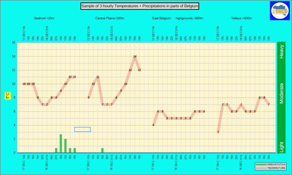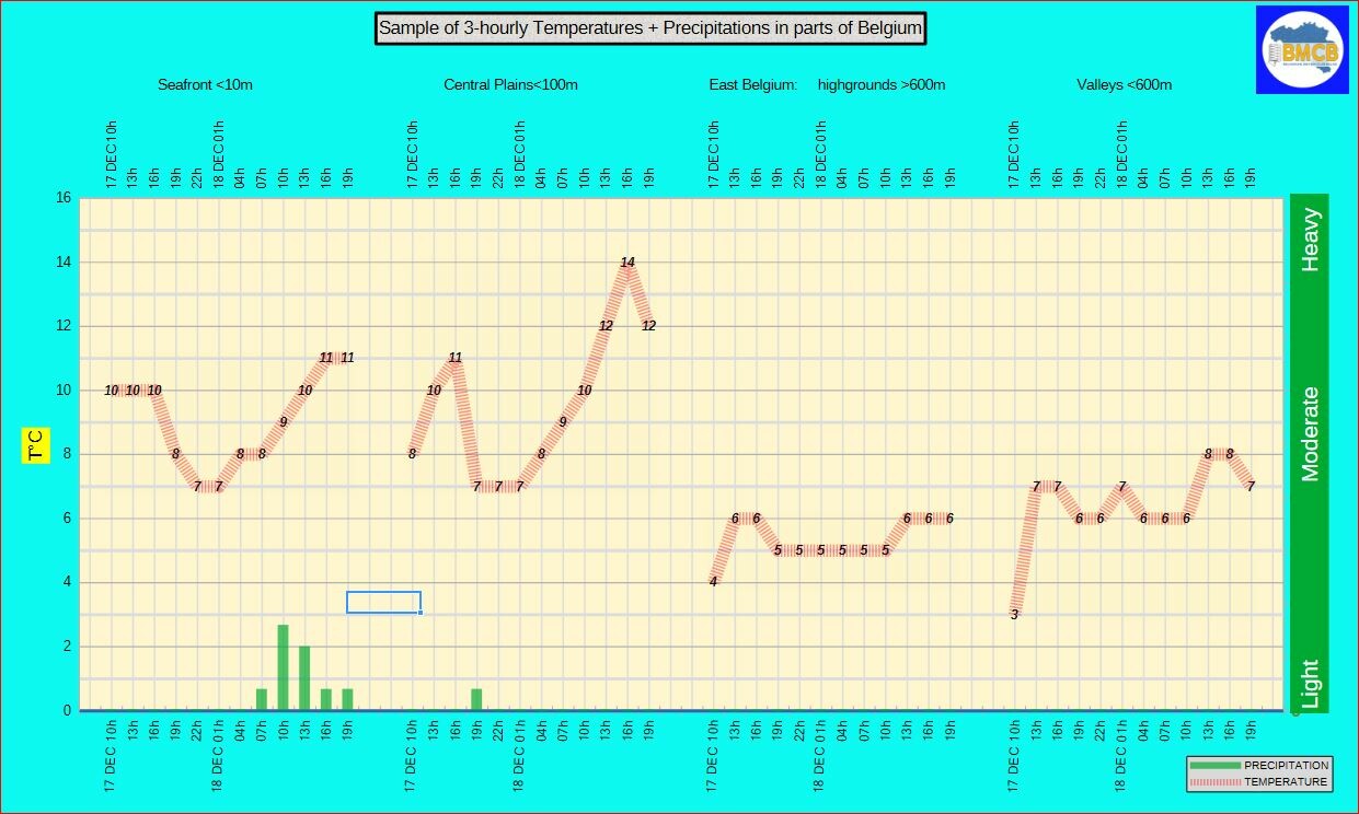 De maximumtemperaturen liggen rond 10°C aan de kust, 8 tot 11°C in het binnenland en 6 tot 7°C in de Hoge Ardennen.