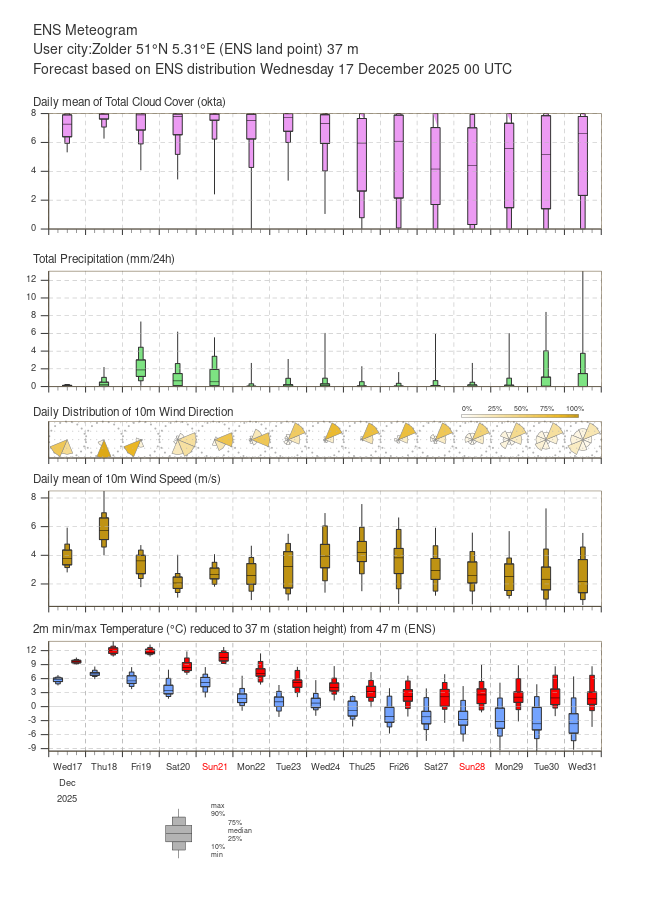 Langdurig NO-winden, maxima net boven 0, minima mediaan zelfs naar -3 en lager voor deze regio.