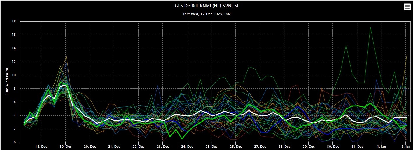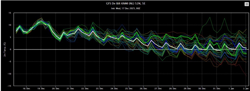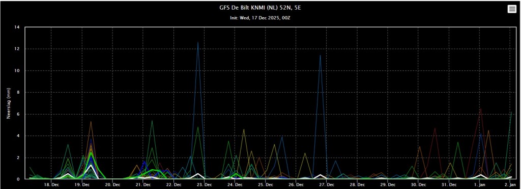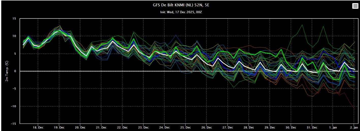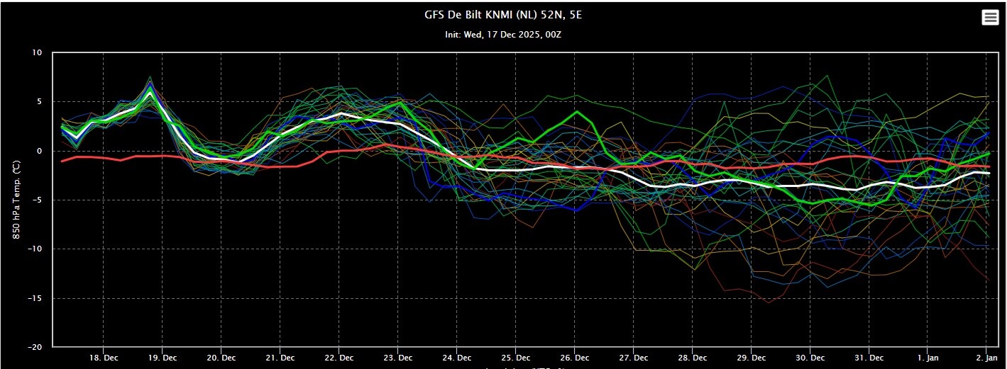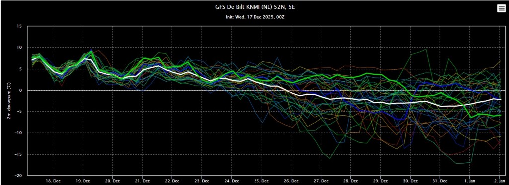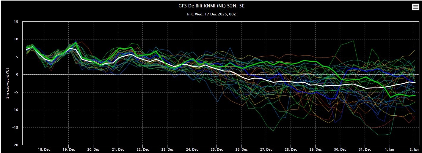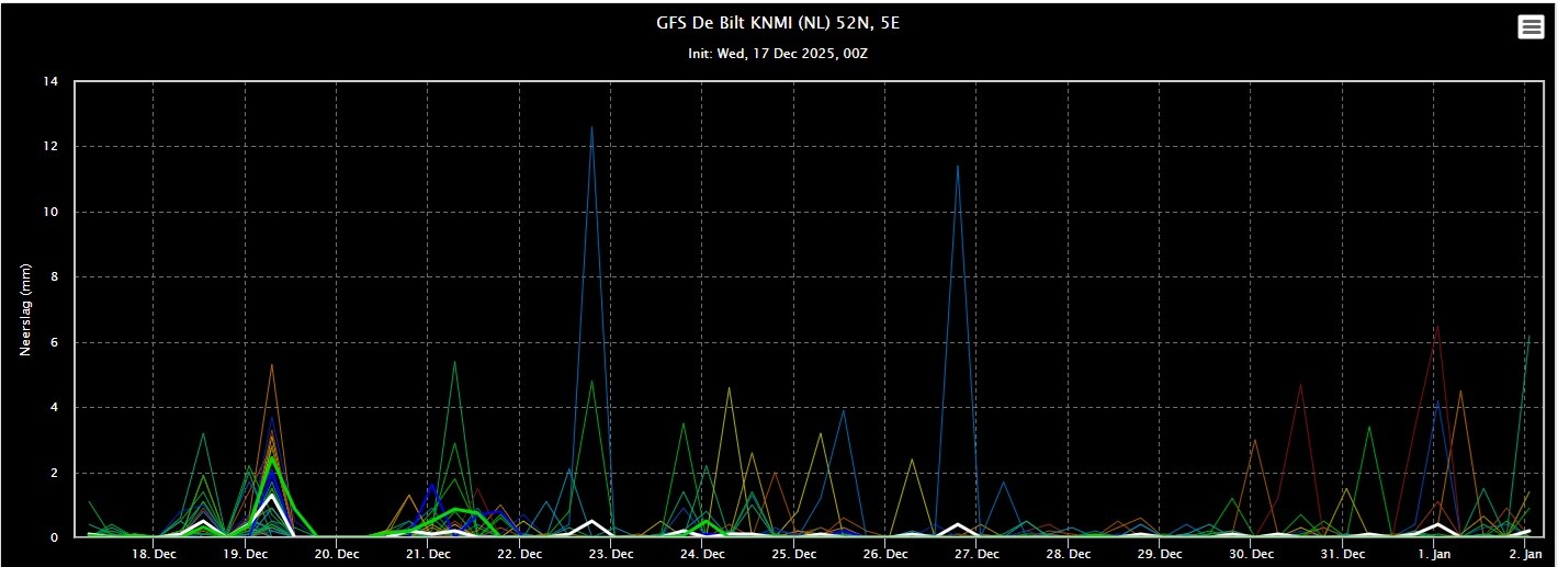 Het ensemble is droog tot nieuwjaar door veel hogedrukinvloeden.