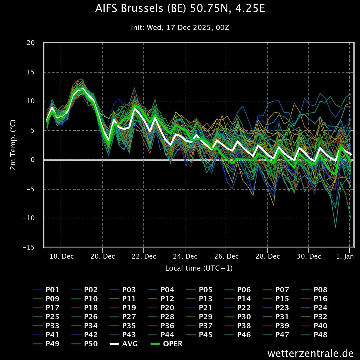 Ook hier begint de afkoeling al vanaf dinsdag tot iets boven nul na de kerstdagen. Maar wel nog onzekerheid wanneer we onder de 5 graden duiken tussen GEFS en EPS/AIFS. Al bij al ook hier een licht winterse pluim vanaf de kerstdagen.