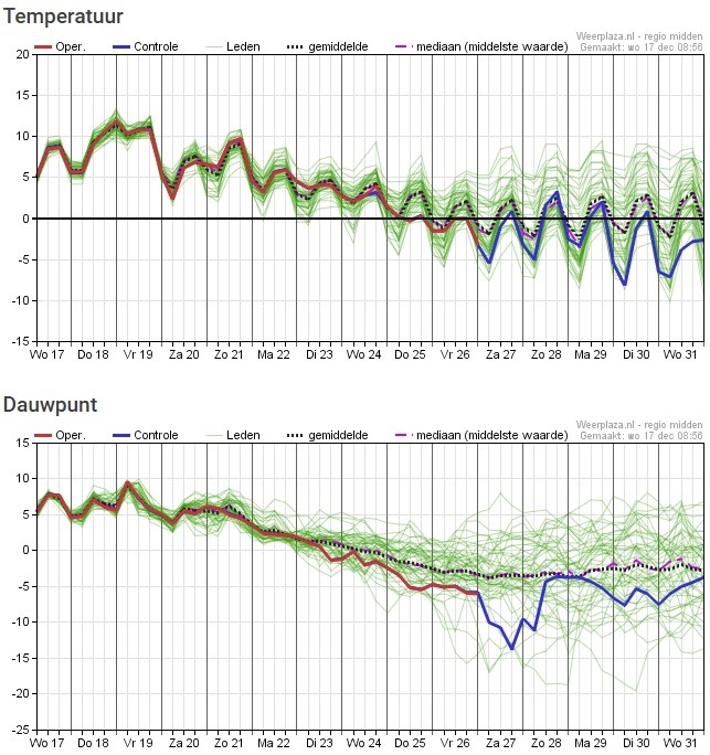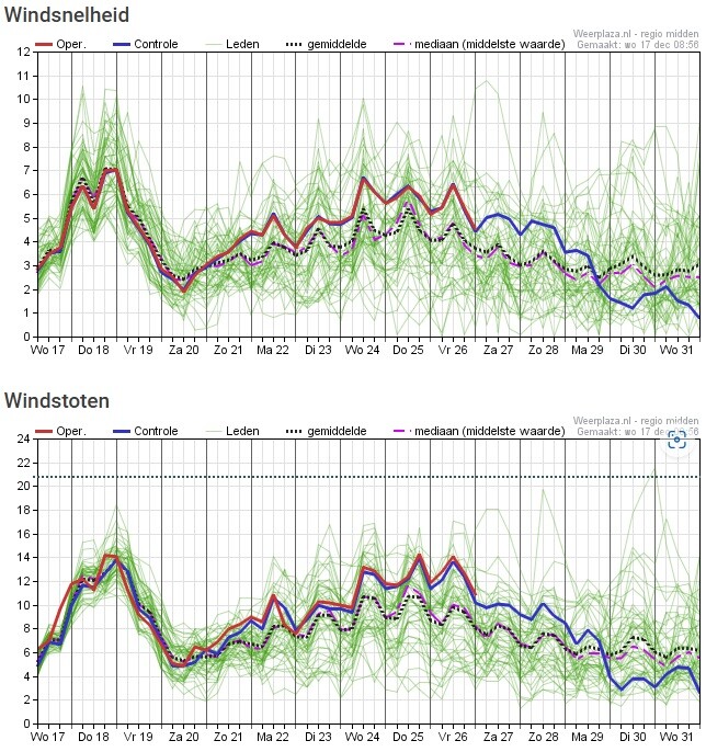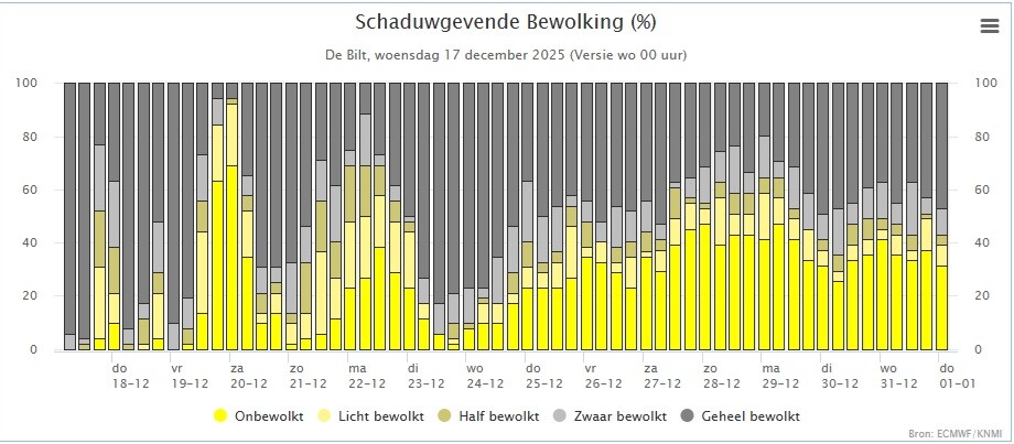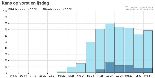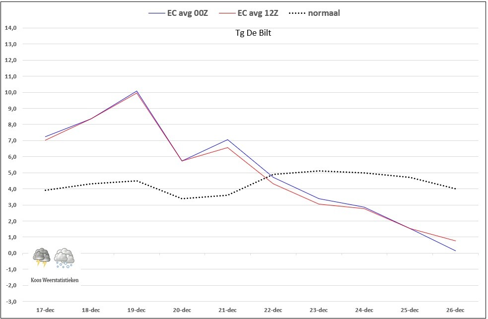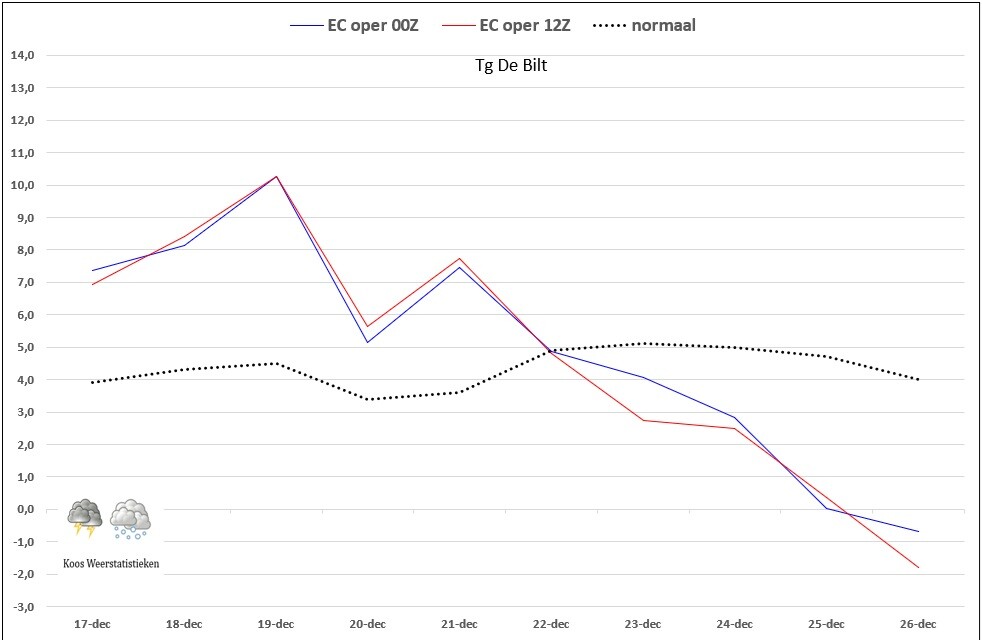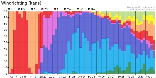 De eerste dagen erg zacht en veel wind. Daarna volgt een overgang naar een weertype met hoofdzakelijk wind uit noordoostelijke richtingen. Vanuit deze hoek wordt geleidelijk koudere lucht aangevoerd. Dit zou na de kerst kunnen leiden tot licht winters weer met vorst in de nachten en overdag temperaturen net iets boven het vriespunt.
