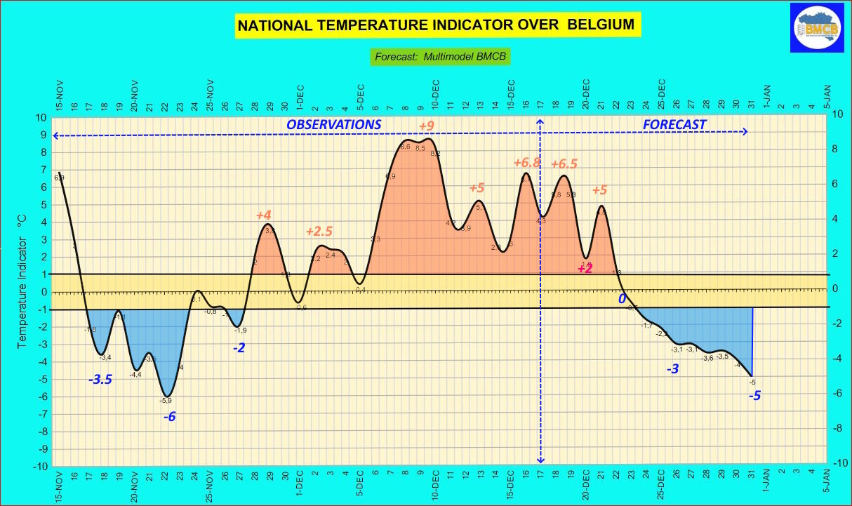 Vanaf 22 december verandert het thermische patroon duidelijk. De nationale index duikt onder nul en zakt geleidelijk van –1 naar –5. De dagtemperaturen volgen die evolutie: 1 tot 7°C aan het begin van de periode, en –3 tot +3°C tegen Nieuwjaar.