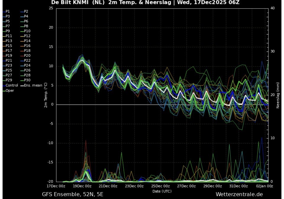 In de loop van volgende week steeds een stapje kouder met daarbij de nodige spreiding. Tmax gaat in de loop van volgende week naar 2-3C overdag wat best fris is voor dit jaargetijde met in de nacht lichte vorst. Daarbij nauwelijks neerslag van betekenis en dus ook nauwelijks kans op sneeuw.