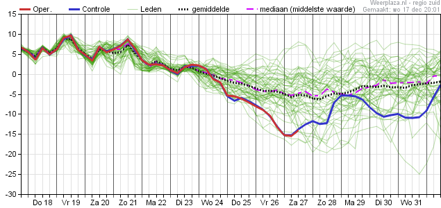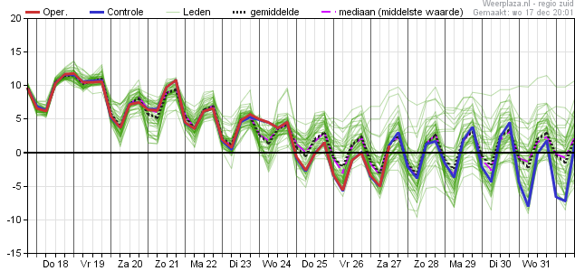 Zo'n beetje hetzelfde verhaal; naarmate de tijd vordert een langzame afkoeling naar 's nachts lichte vorst en overdag enkele graden in de plus. Dauwpunten hierbij waarschijnlijk geleidelijk onder het vriespunt en beginnende ijsvorming. Sneeuwkansen zijn voorlopig nihil.