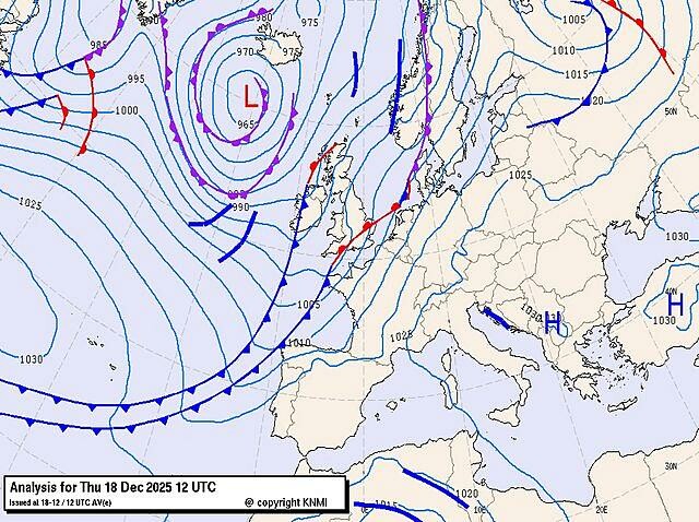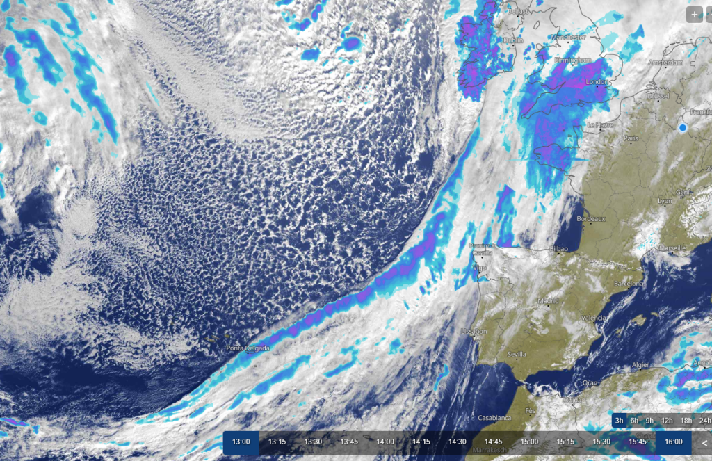 Op de oceaan zijn achter het (dubbele) koufront de typische wolkenschollen te zien die bij zo'n situatie passen. Het (achterste) koufront ziet er, samen met de neerslagband, nogal messcherp uit. Daarbij trouwens ook heel wat neerslag in Ierland en zuid Engeland.