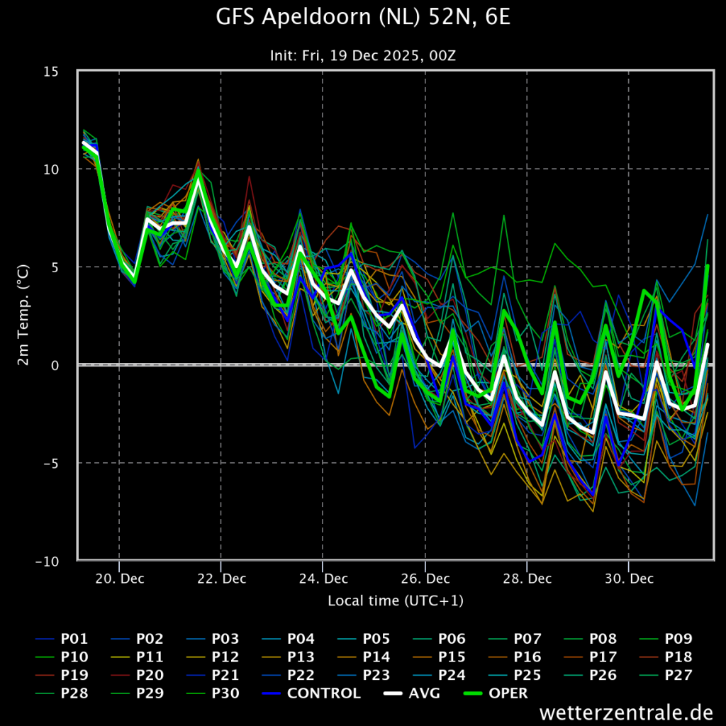 GFS00Z: koud winterweer volgens Control. Wel onderin ensemble
