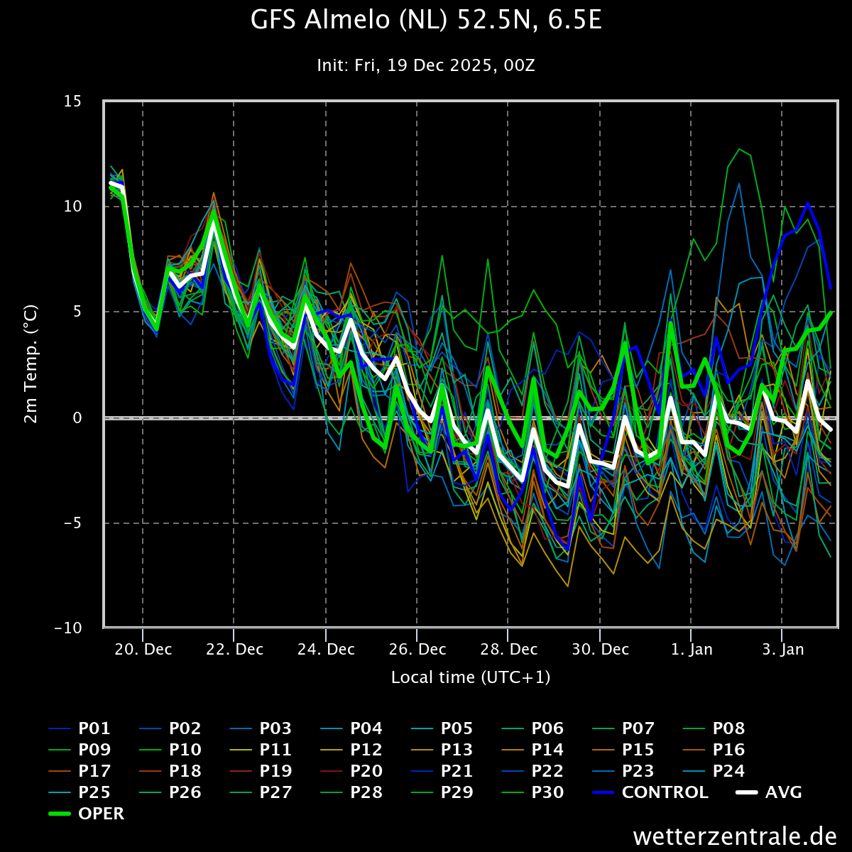 GFS00Z: koud winterweer volgens Control. Wel onderin ensemble
