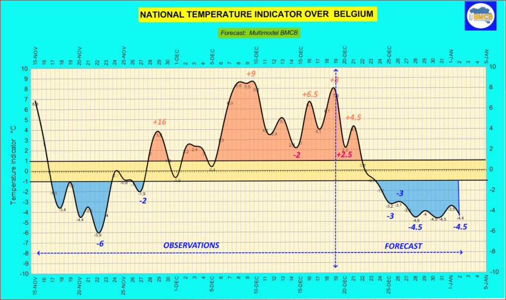 Vanaf 22 december verandert het thermisch signaal duidelijk van toon. De nationale index zakt onder nul en zal na Kerstmis schommelen tussen –3 en –5. Dit betekent dagtemperaturen tussen +4 en –3°C, een duidelijke overgang naar winterse omstandigheden.